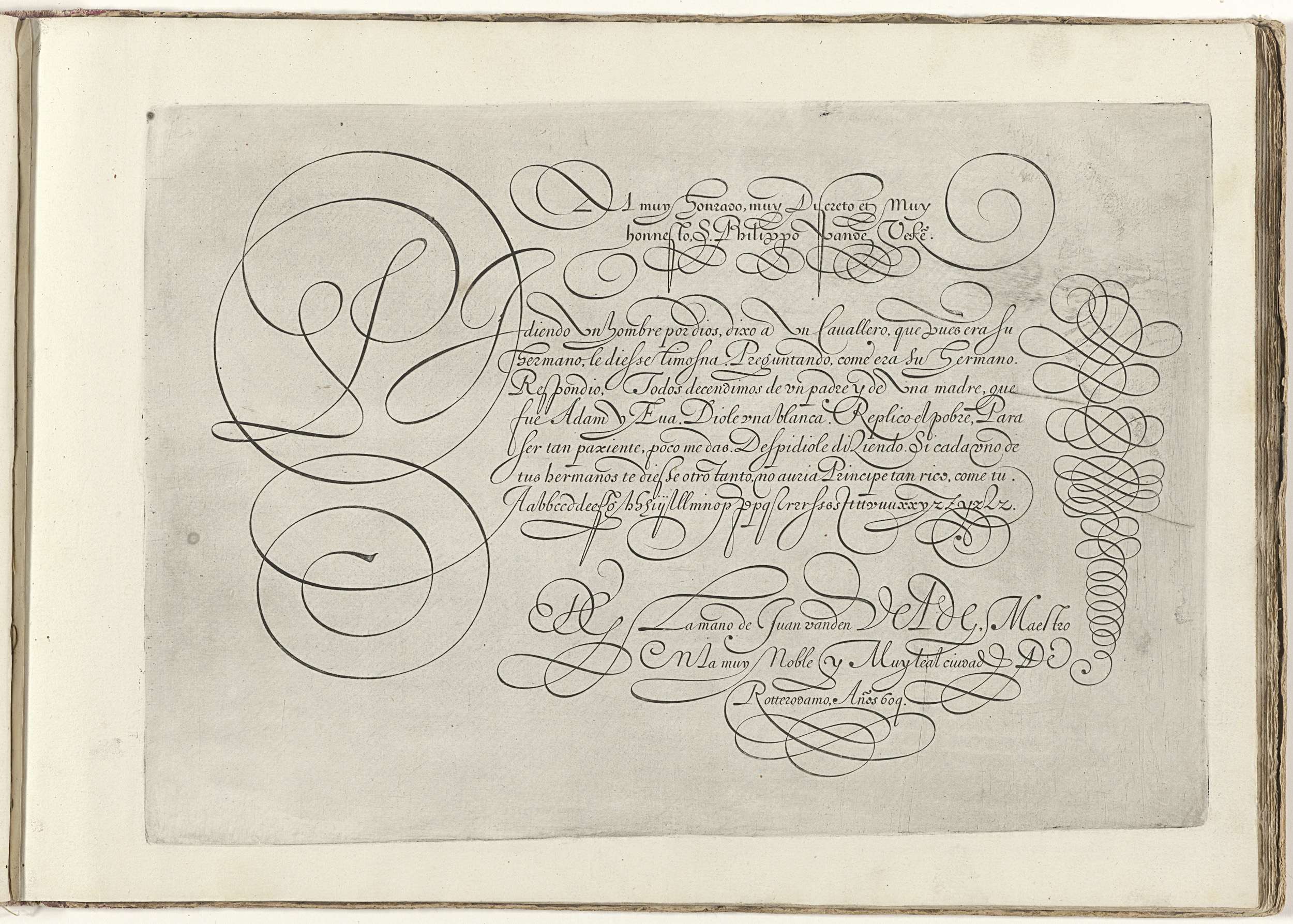 Schrijfvoorbeeld met de aanhef: Al muy honrado, muy discreto et muy honnesto, S. Philippo vande Veke(n). Daaronder zeven regels tekst in het Spaans: Pidiendo un hombre ... De tekst eindigt met een onderkastalfabet in dezelfde hand en is ondertekend: DG La mano de Juan vanden Velde ... Rechts krulwerk. De prent maakt deel uit van ...