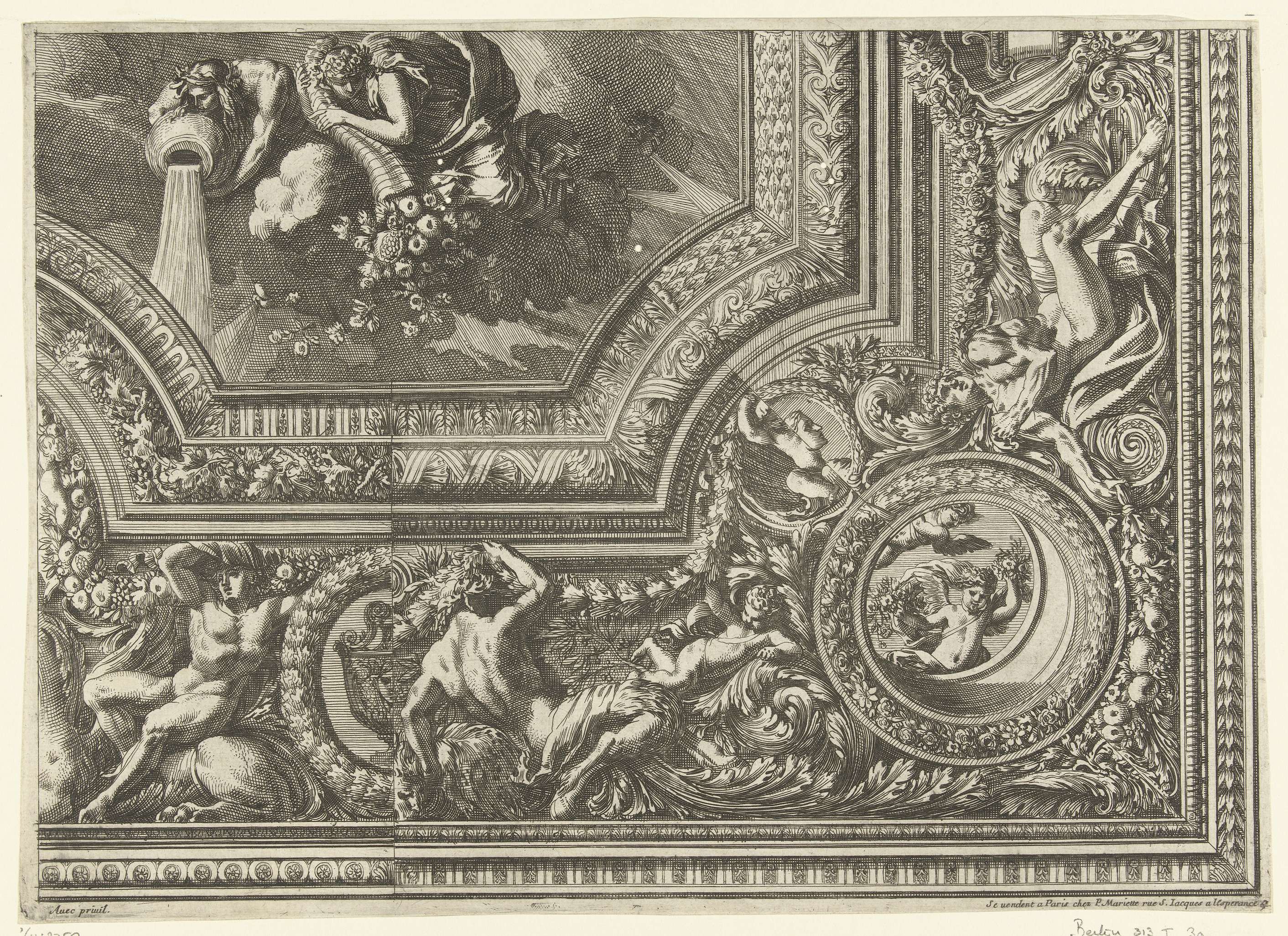 Aurora strooit bloemen uit een hoorn des overvloeds. Met varianten voor drie maal een achtste gedeelte van de rand. Blad 5 uit serie van 6 bladen met ontwerpen voor plafonds, sommige met varianten voor de randen. Uit tweede editie.