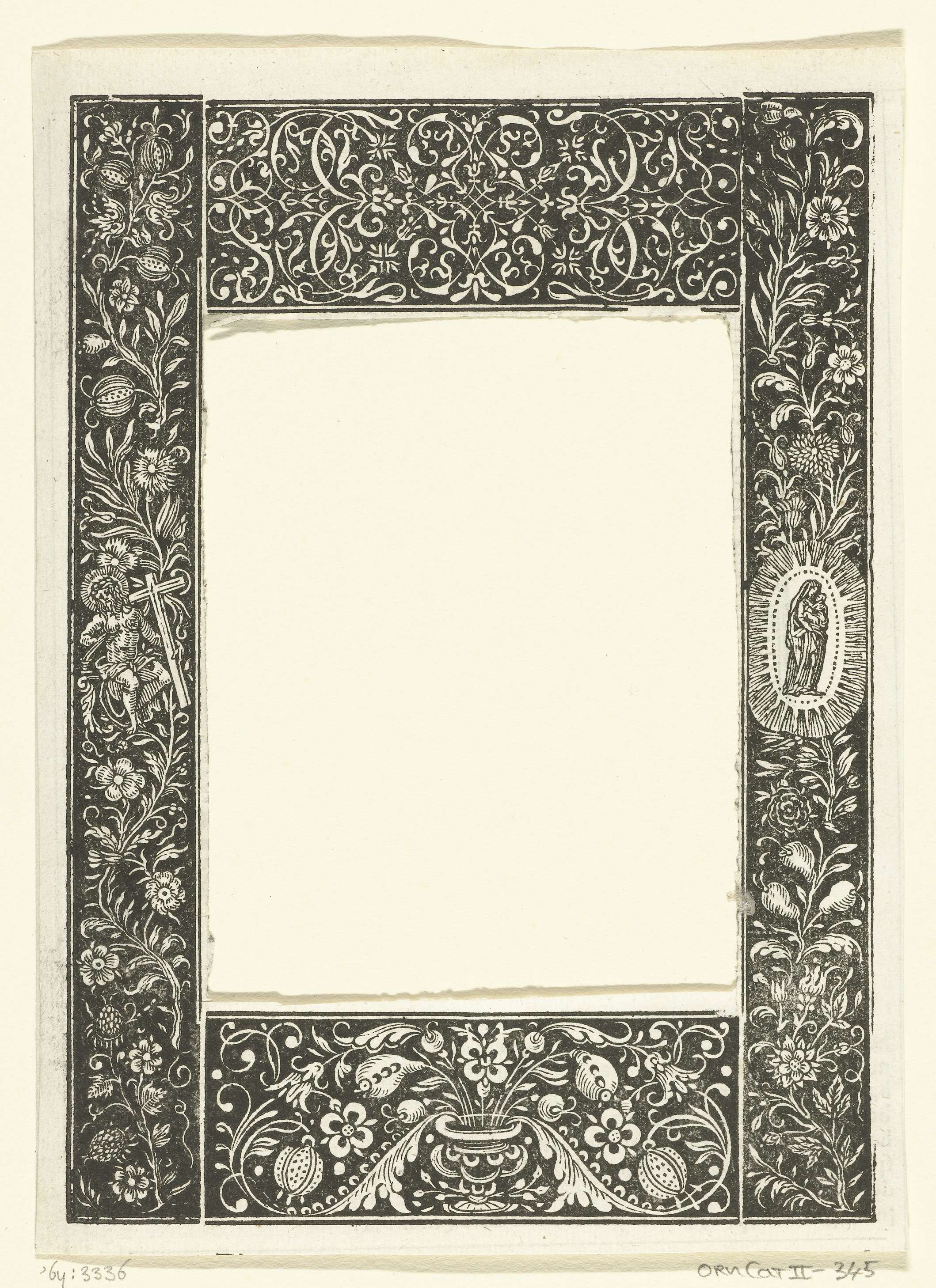 Omlijsting gedrukt van vier houtblokken. Op het fries onderaan staat een vaas, op het linkerpaneel is Christus te zien. De lijsten zijn grotendeels varianten of kopieën naar laat zestiende eeuwse Franse en Vlaamse prenten. Alle omlijstingen werden gebruikt om een Bijbel te illustreren.