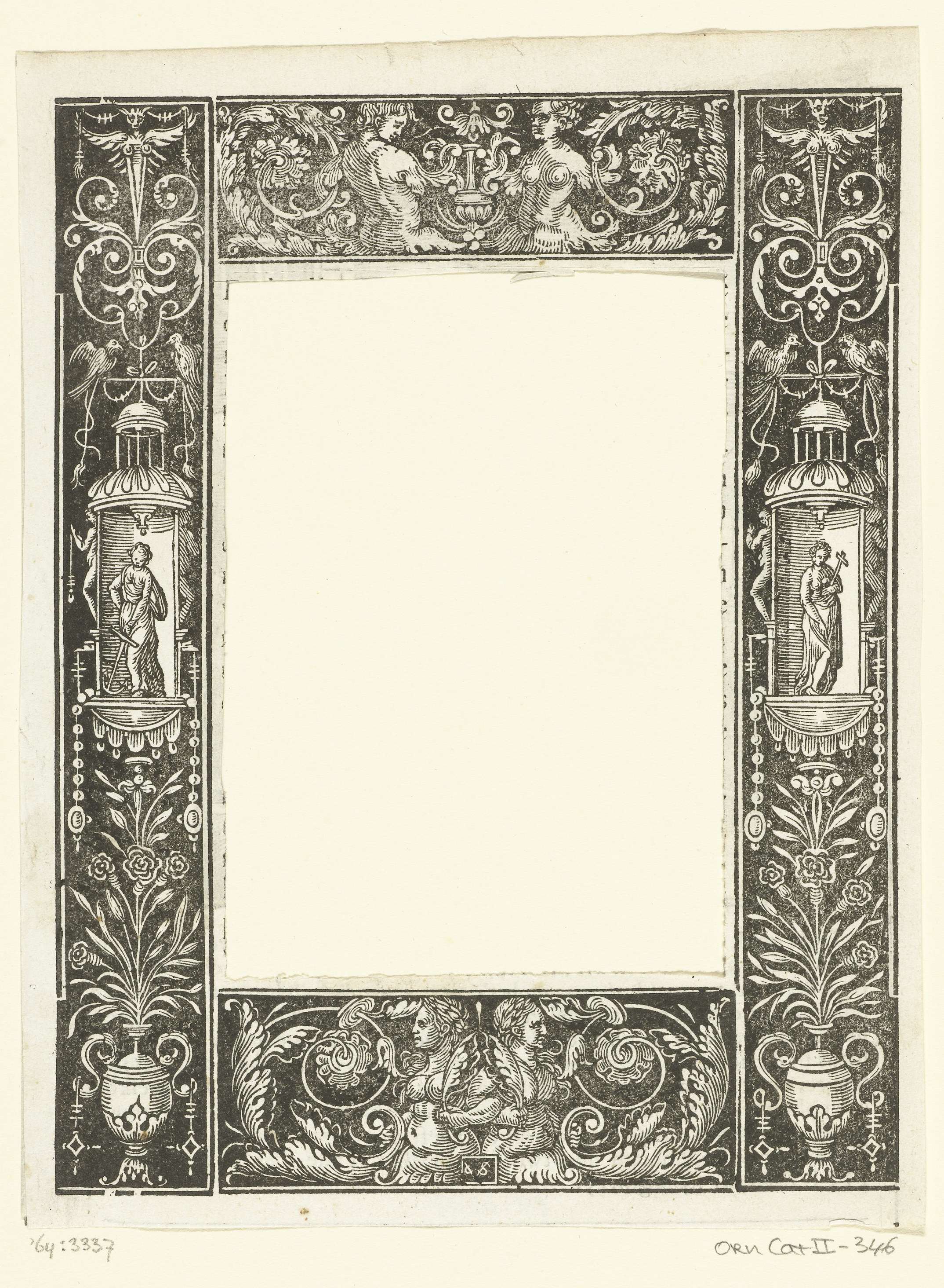 Omlijsting gedrukt van vier houtblokken. Op beide panelen staat onderaan een bloemenvaas, daarboven staat Hoop of Geloof in een nis. De lijsten zijn grotendeels varianten of kopieën naar laat zestiende eeuwse Franse en Vlaamse prenten. Alle omlijstingen werden gebruikt om een Bijbel te illustreren.