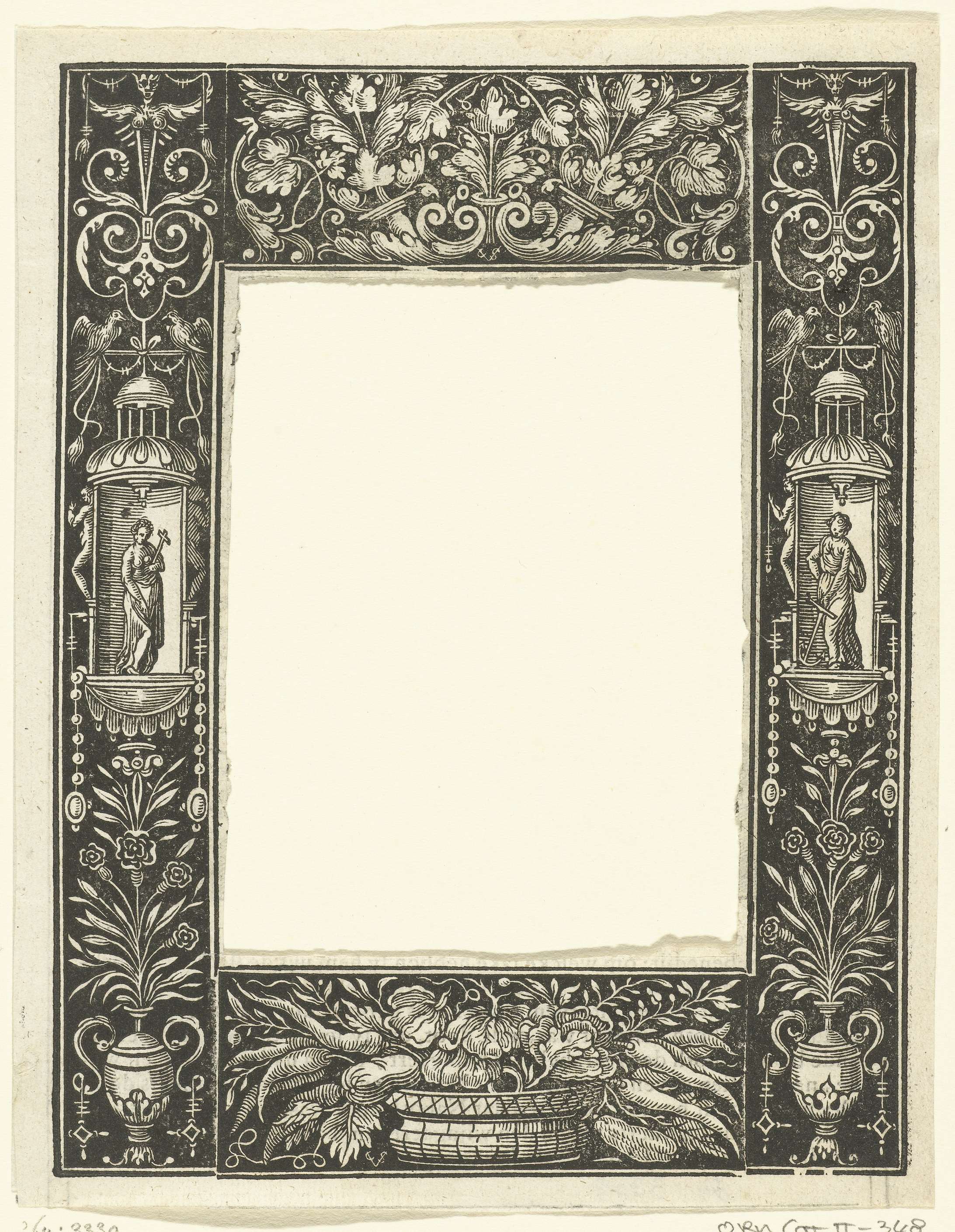 Omlijsting gedrukt van vier houtblokken. Op het fries onderaan staat een mand met groenten. De lijsten zijn grotendeels varianten of kopieën naar laat zestiende eeuwse Franse en Vlaamse prenten. Alle omlijstingen werden gebruikt om een Bijbel te illustreren.