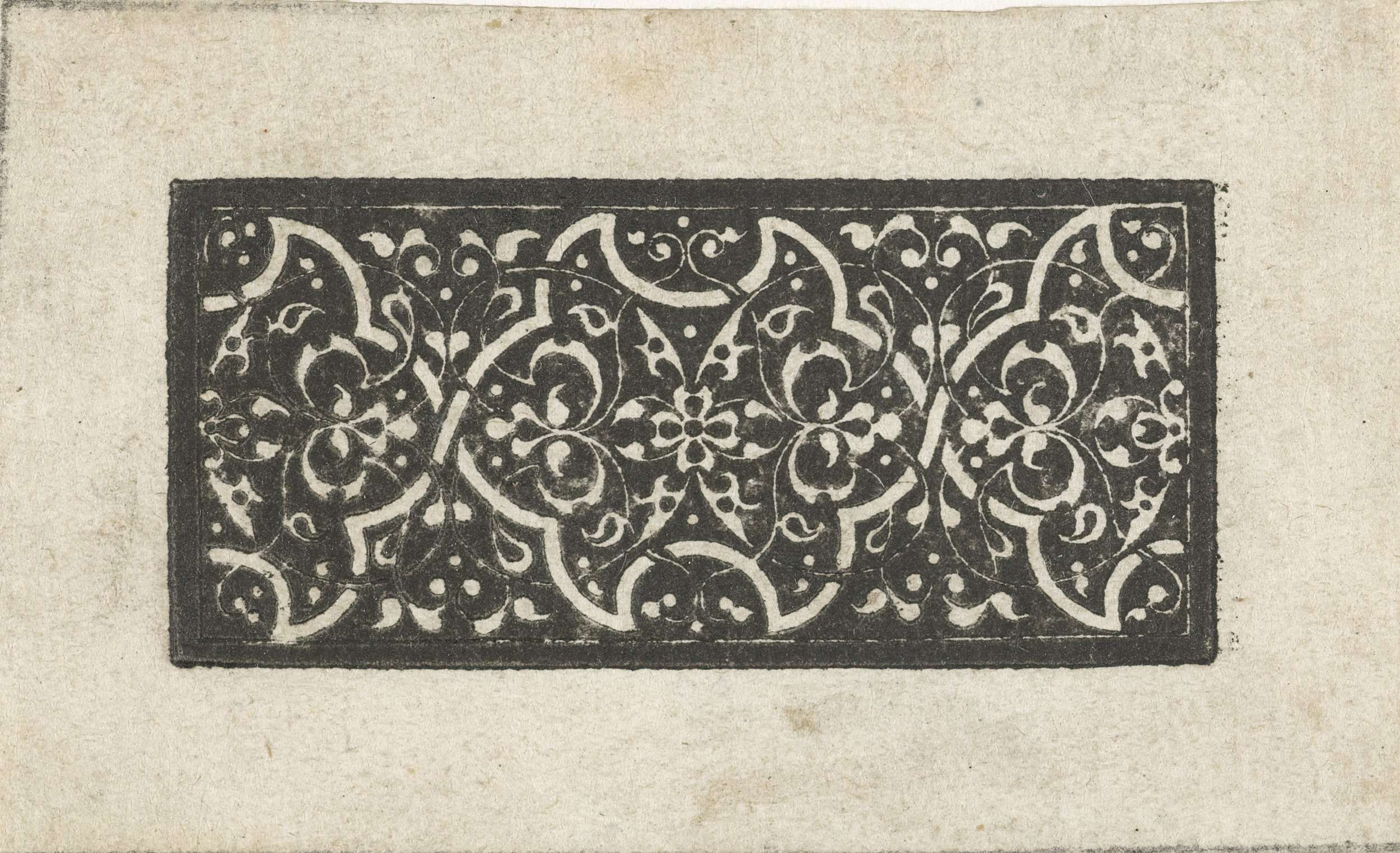 Moresken en arabesken in een motief dat één maal in het midden wordt weergegeven en zowel links als rechts daarvan nog eens voor de helft zichtbaar is.