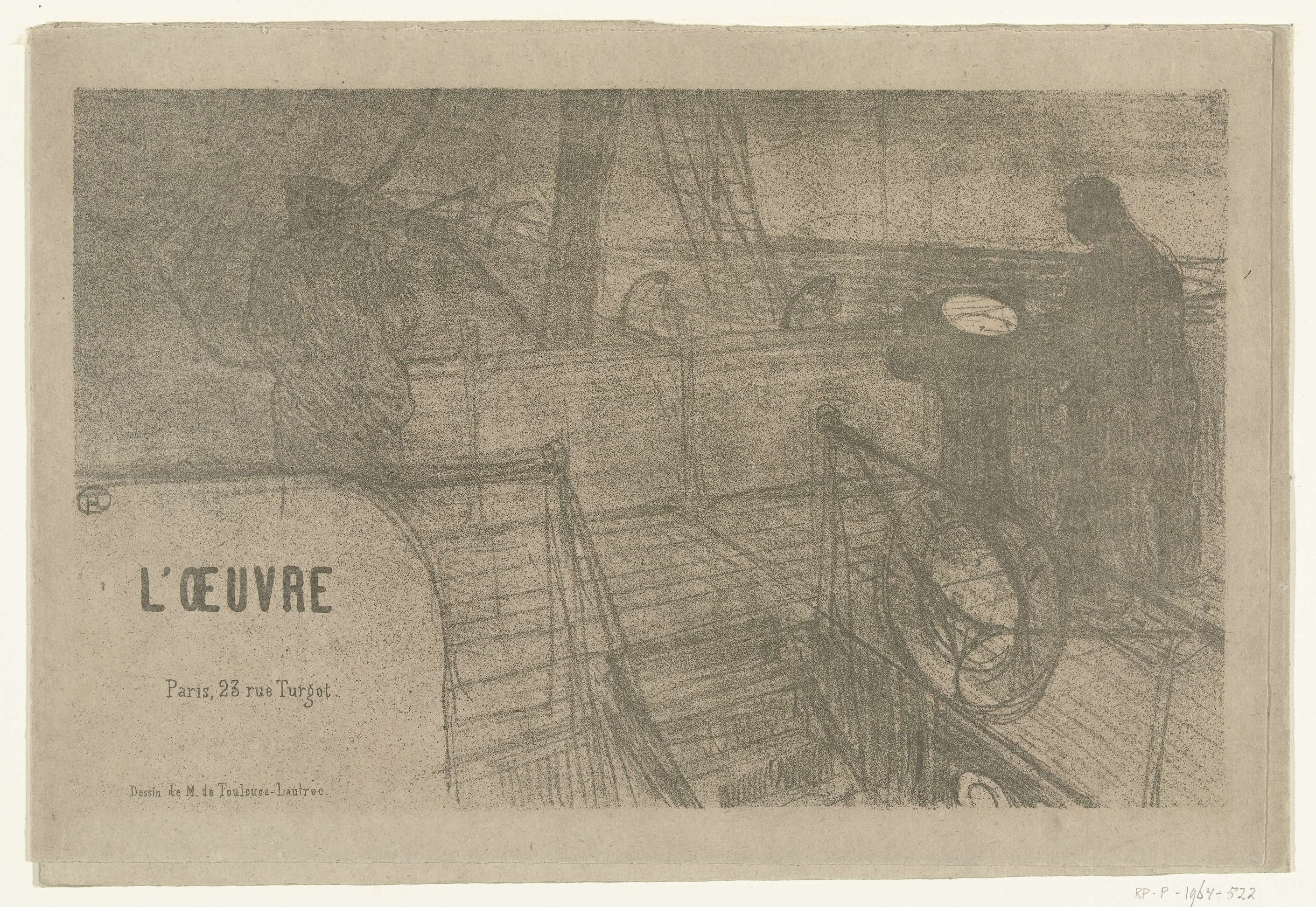 Brochure met programma voor het theater L'Oeuvre. Op het vouwblad staan illustraties van verschillende kunstenaars, de lithografie op de voorkant is vervaardigd door Toulouse-Lautrec. Twee matrozen staan op het dek van een zeilschip met hun blik op de zee voor hen gericht. Aan de binnenzijde van de brochure presenteert de organisatie van het theater L'Oeuvre ...