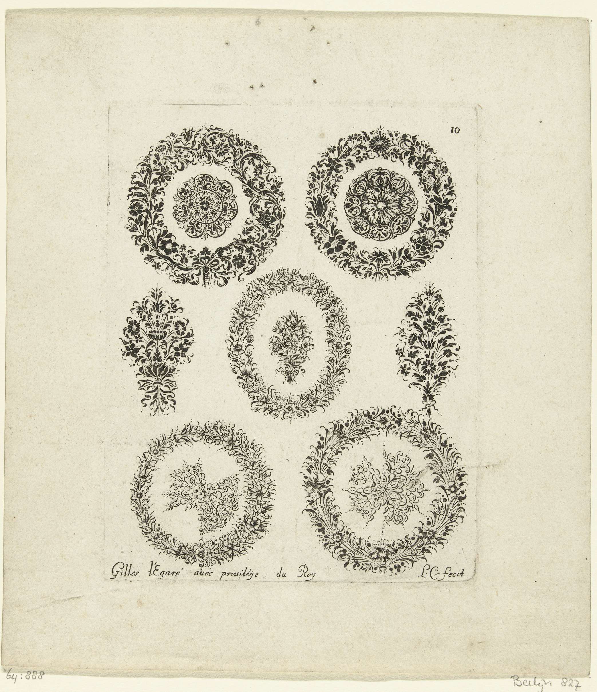 Vier ronde en één ovale rand van bloemen en bladeren, gedeeltelijk zwartornamenten, waarin andere motieven zijn verwerkt, en twee boeketten van bloemen. Blad 10 uit tweede serie met ontwerpen voor juwelen bestaande uit 6 bladen.