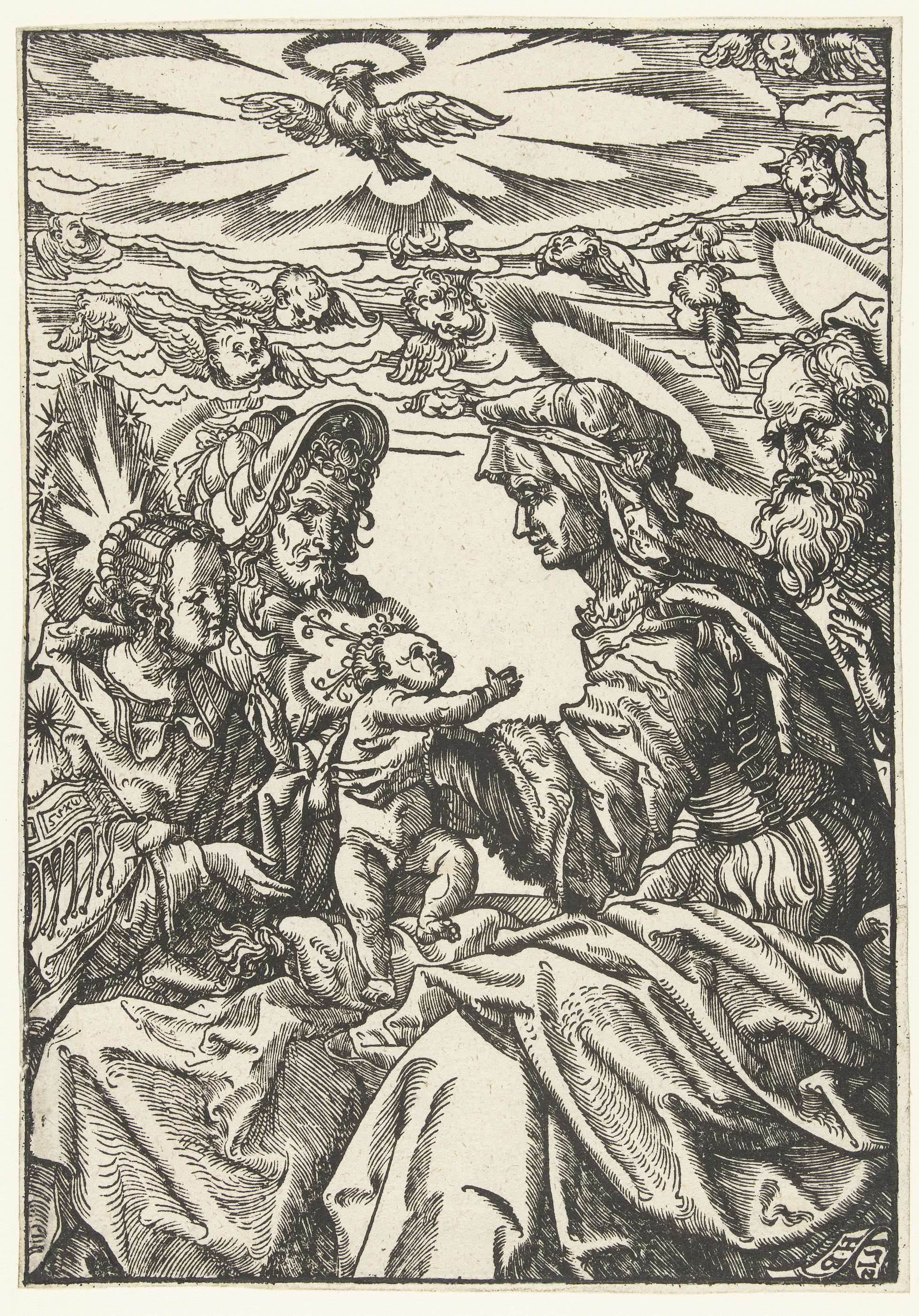 Anna neemt het Christuskind in haar armen van Maria's schoot terwijl Jozef en Joachim toekijken. In de hemel zweeft de duif als symbool van de heilige Geest omringd door engelenkopjes.