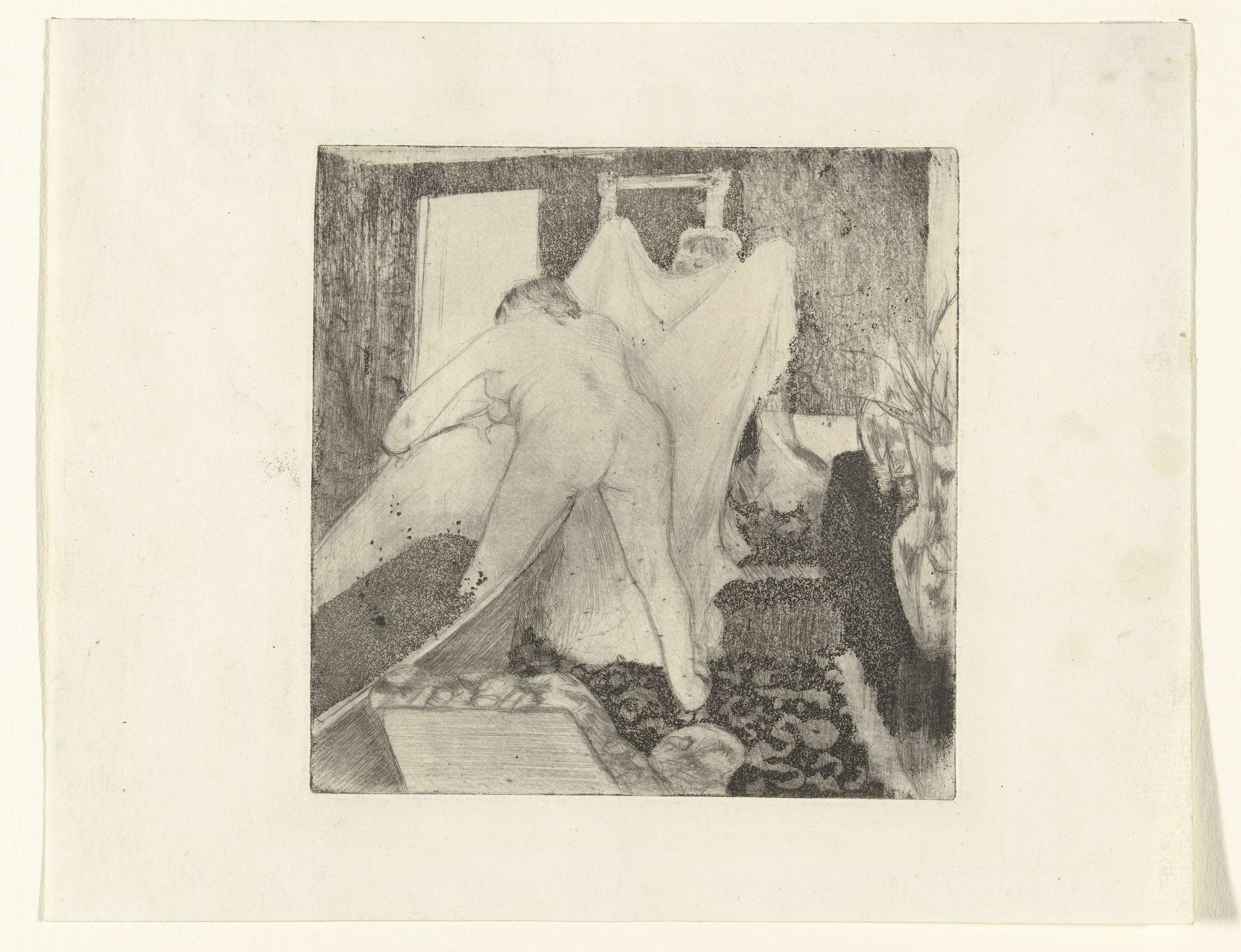 Een vrouw stapt uit bad terwijl zij zich vasthoudt aan de rand van het bad en ze krijgt een handdoek aangereikt van een andere vrouw. Op de voorgrond staat een stoel en rchts vazen met planten in het interieur.