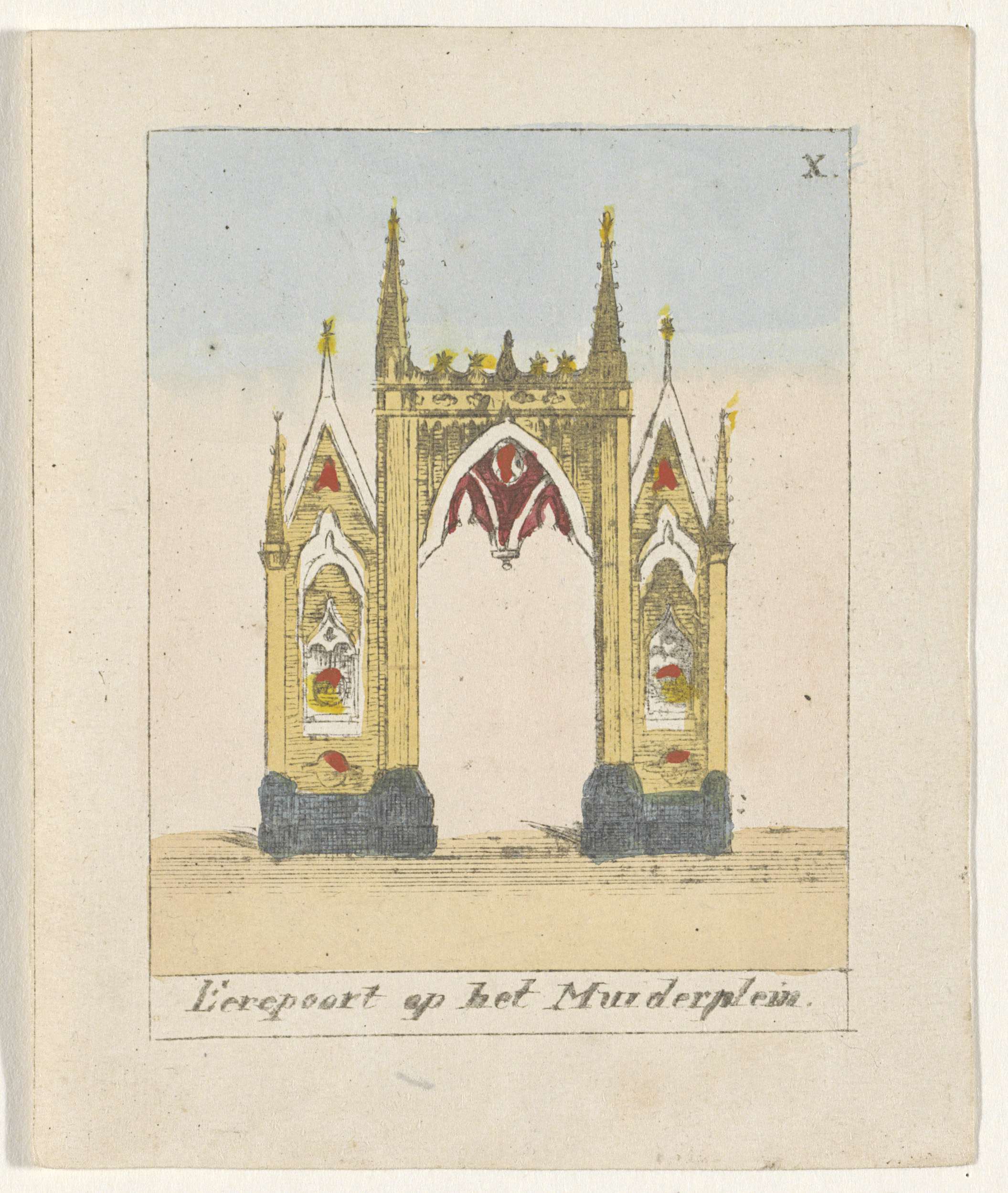 Erepoort opgericht op het Muiderplein. Onderdeel van mapje met een serie van twaalf prentjes van de intocht van Willem II, de erepoorten opgericht in de stad en de inhuldiging op 28 november 1840 in de Nieuwe Kerk te Amsterdam.