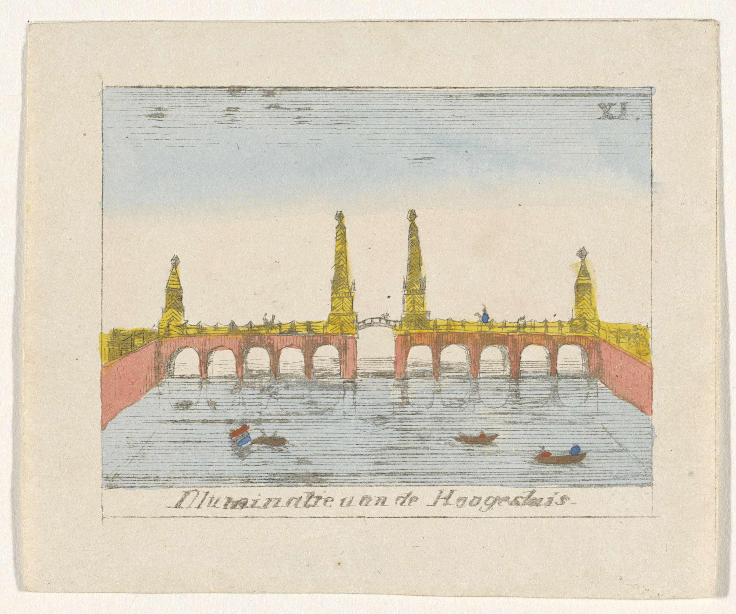 Illuminatie op de Hogesluis. Onderdeel van mapje met een serie van twaalf prentjes van de intocht van Willem II, de erepoorten opgericht in de stad en de inhuldiging op 28 november 1840 in de Nieuwe Kerk te Amsterdam.