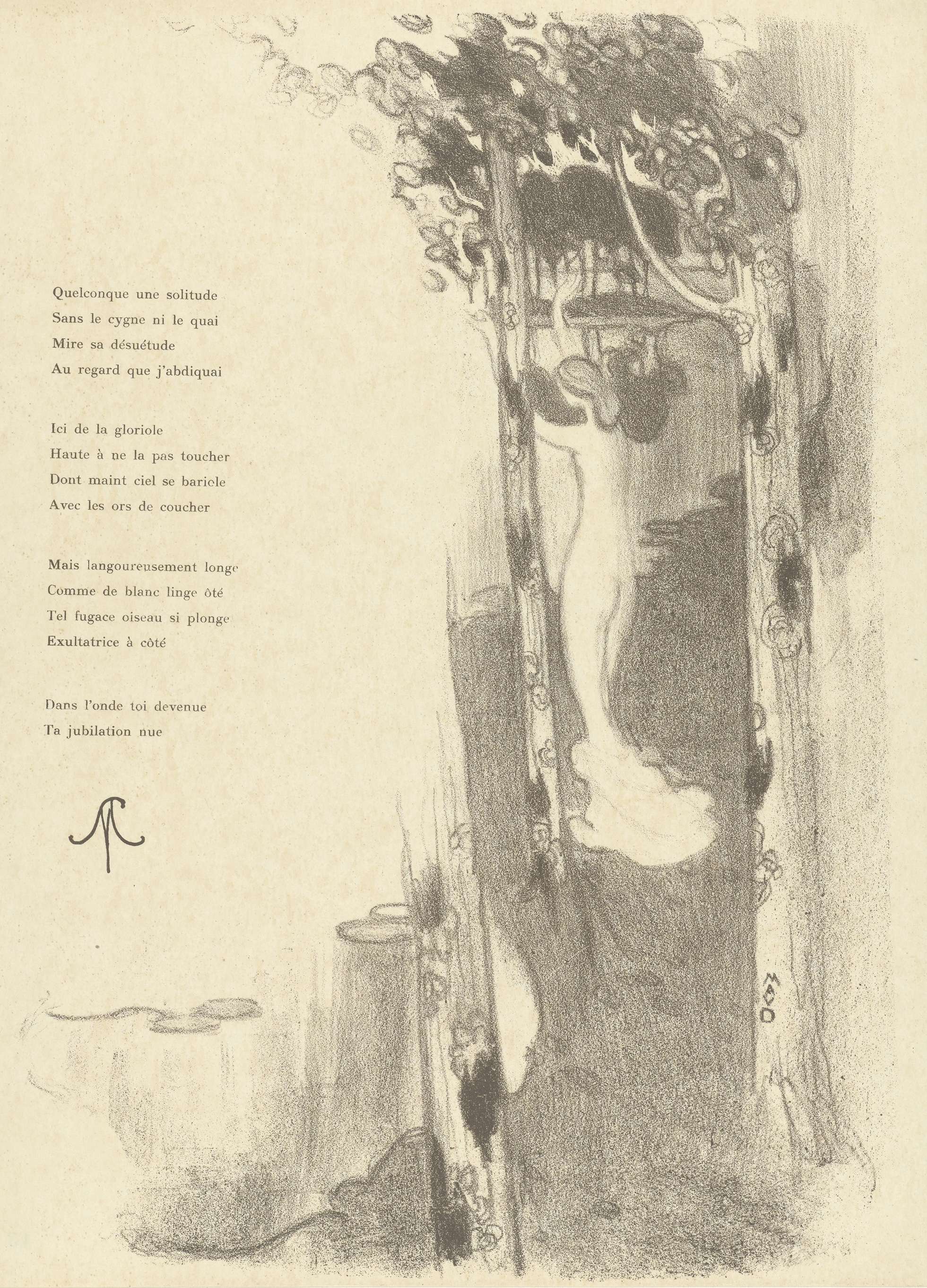 Illustratie met staande naakte vrouw tussen bomen bij een meer bij gedicht Petit Air van Stéphane Mallarmé
