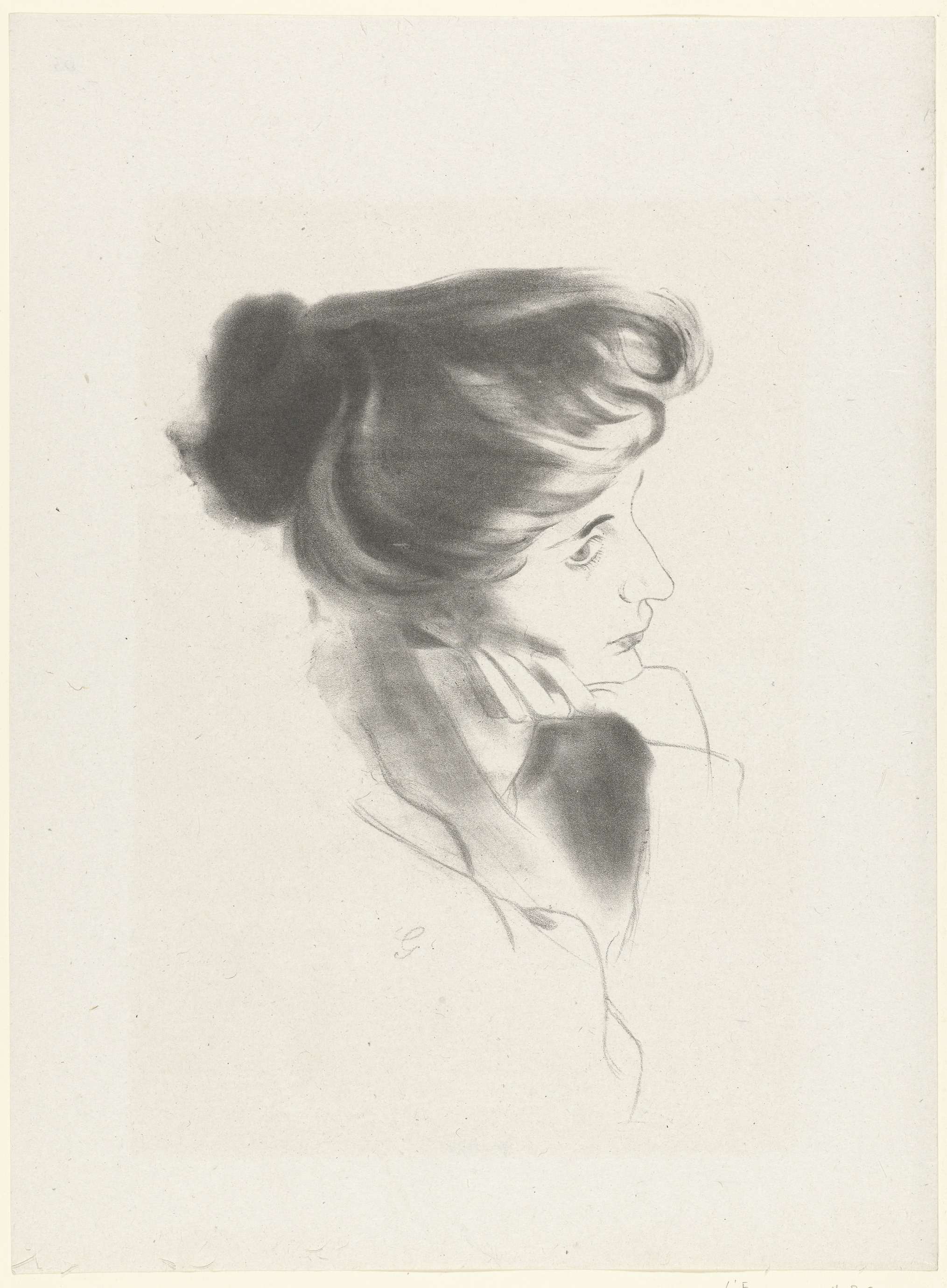 Hoofd van vrouw met kin rustend op haar hand