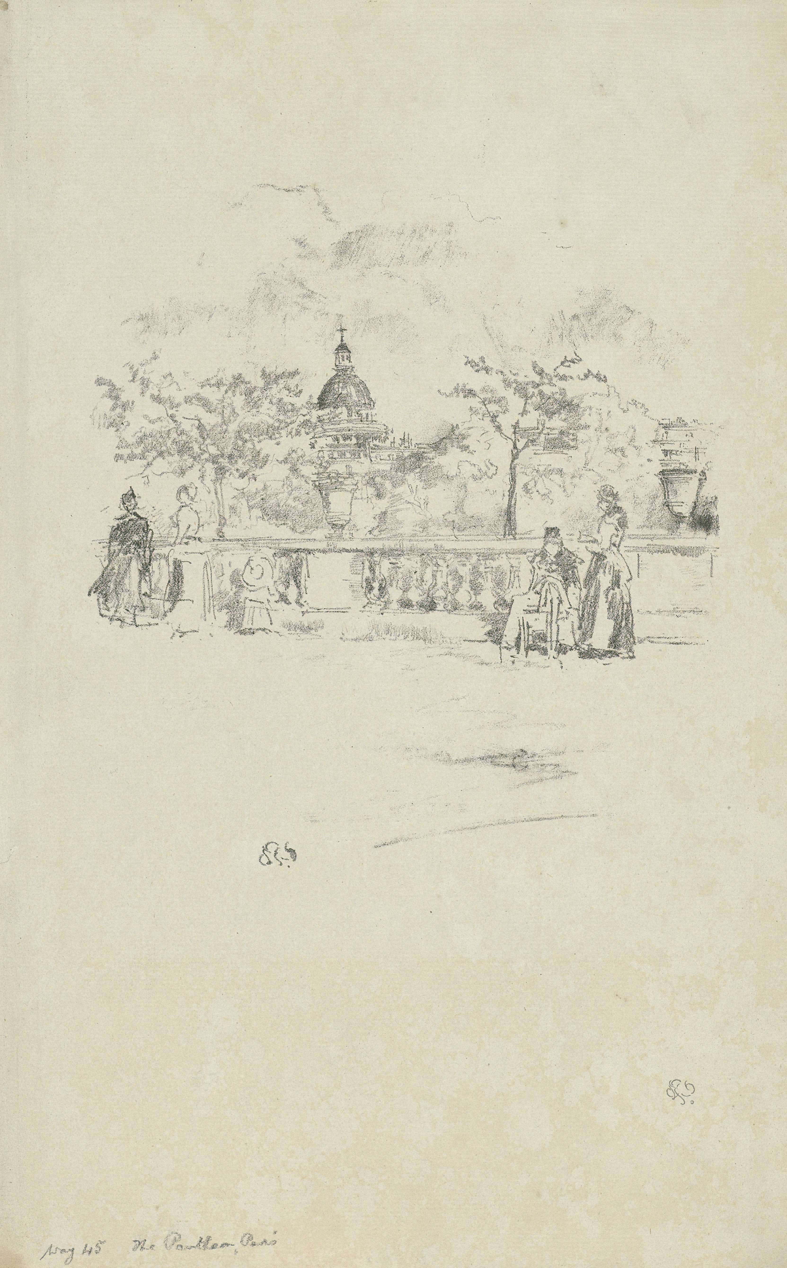 Balustrade van een terras in de Jardin du Luxembourg. In de verte de koepel van het Panthéon.