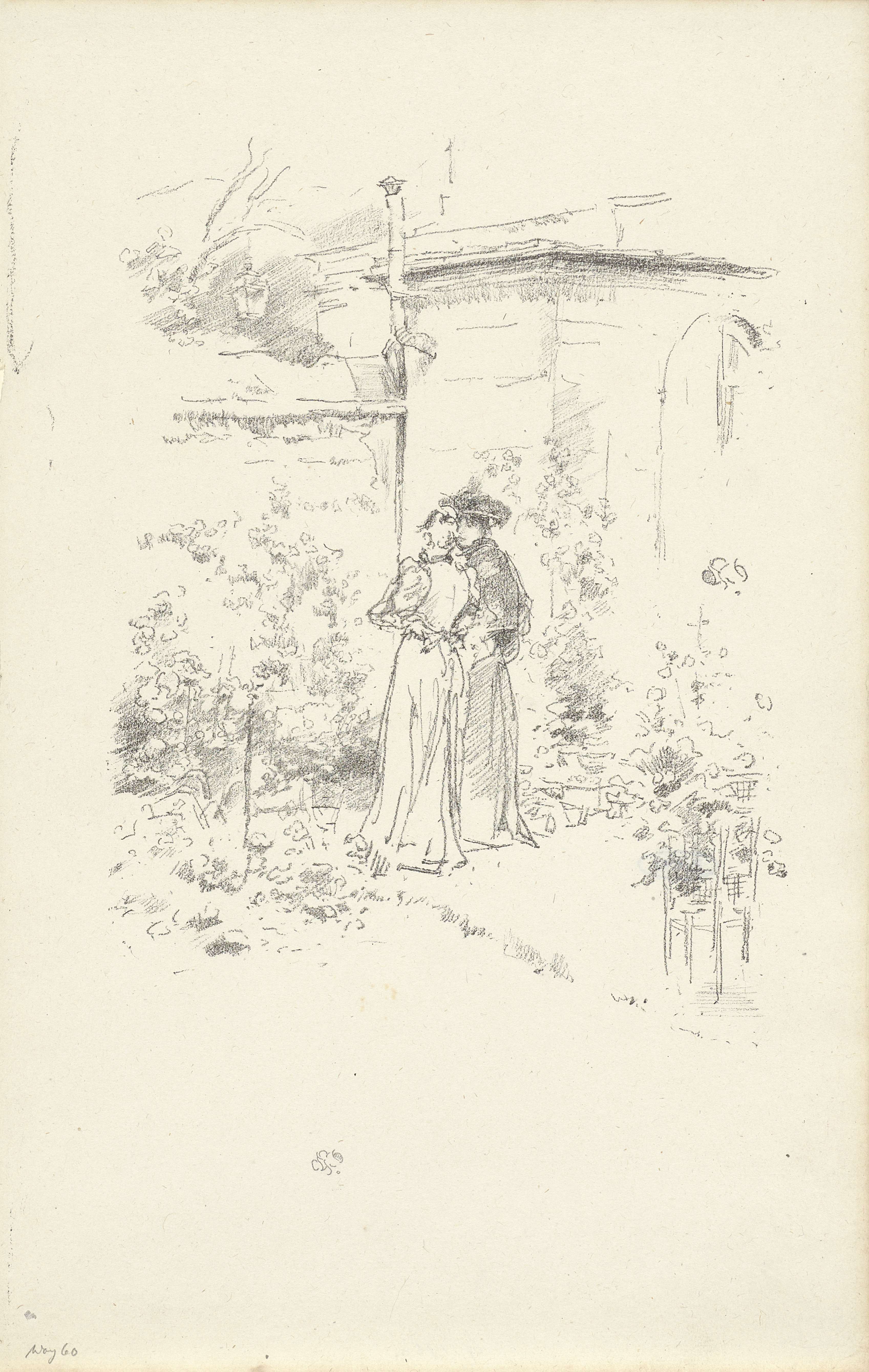 Twee vrouwen op de rug gezien, staand in een bloementuin, in gesprek met elkaar.