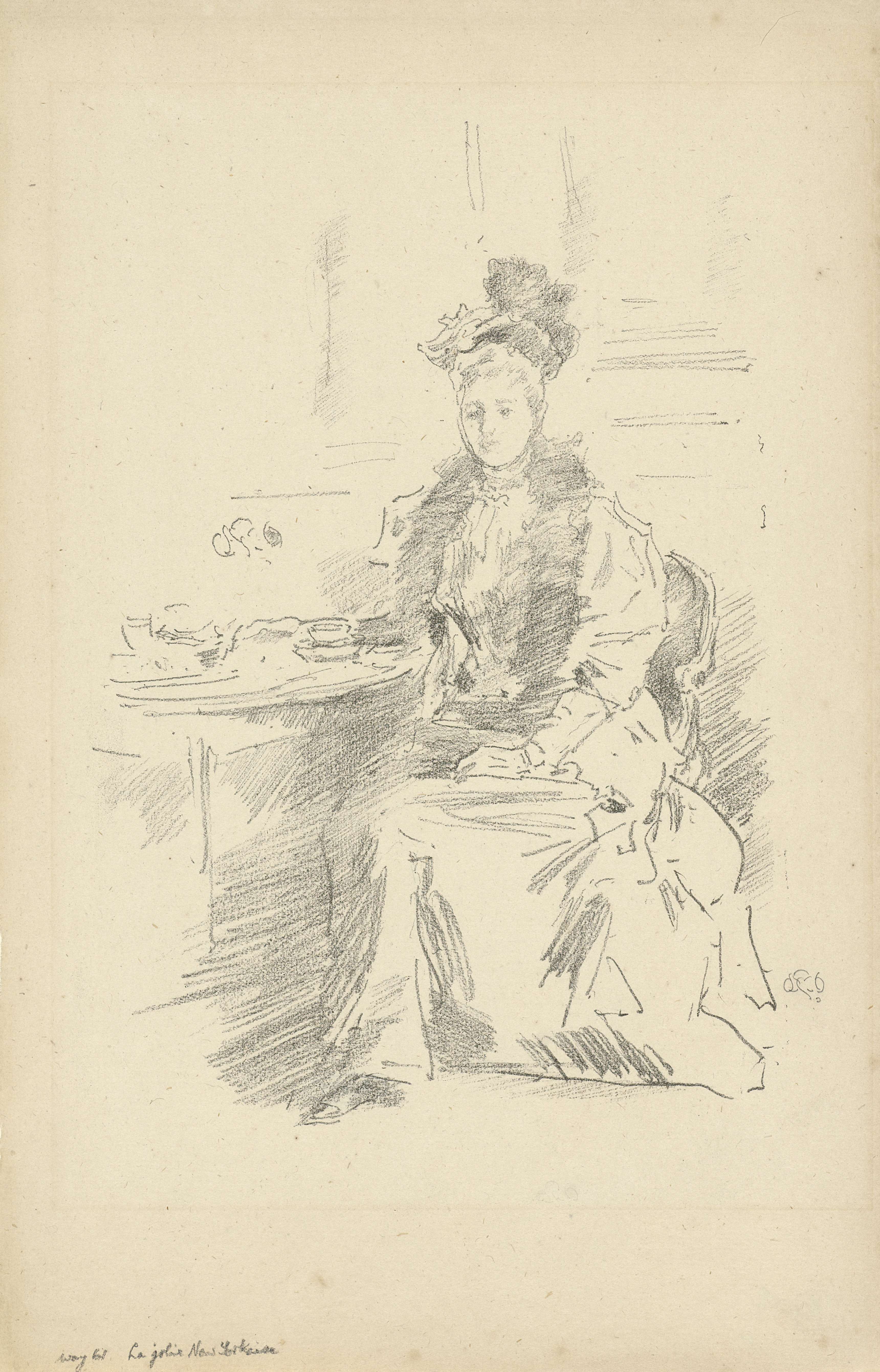 Een vrouw, van voren gezien, gezeten aan een tafel, haar linkerhand op haar schoot.