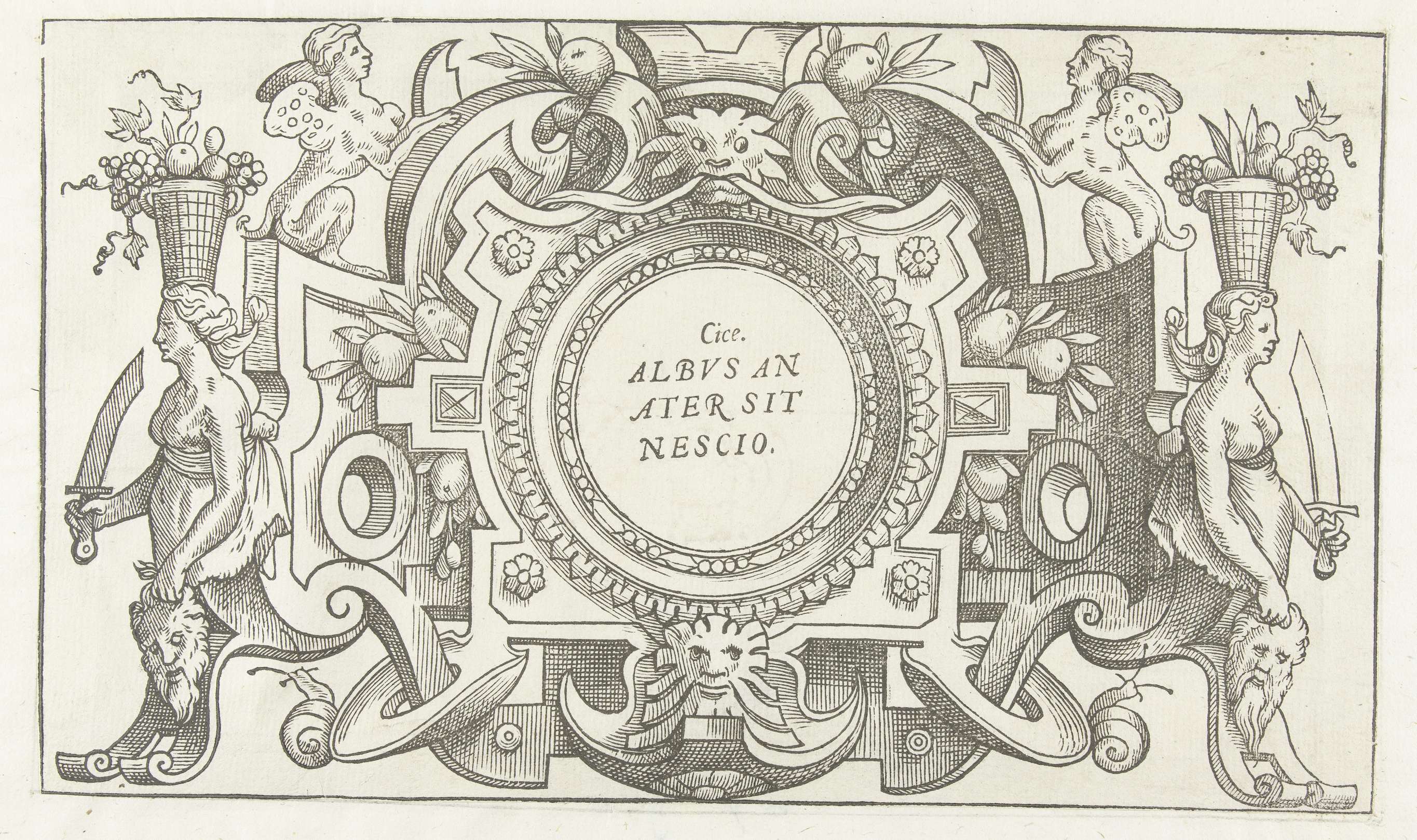 Zowel links als rechts loopt het rolwerk uit het bovenlichaam van een vrouw die in de ene hand een houwer houdt en in de andere het hoofd van een man. Blad hoort bij 15 bladen met titelblad afkomstig uit een serie van 24 bladen. Houtsneden.
