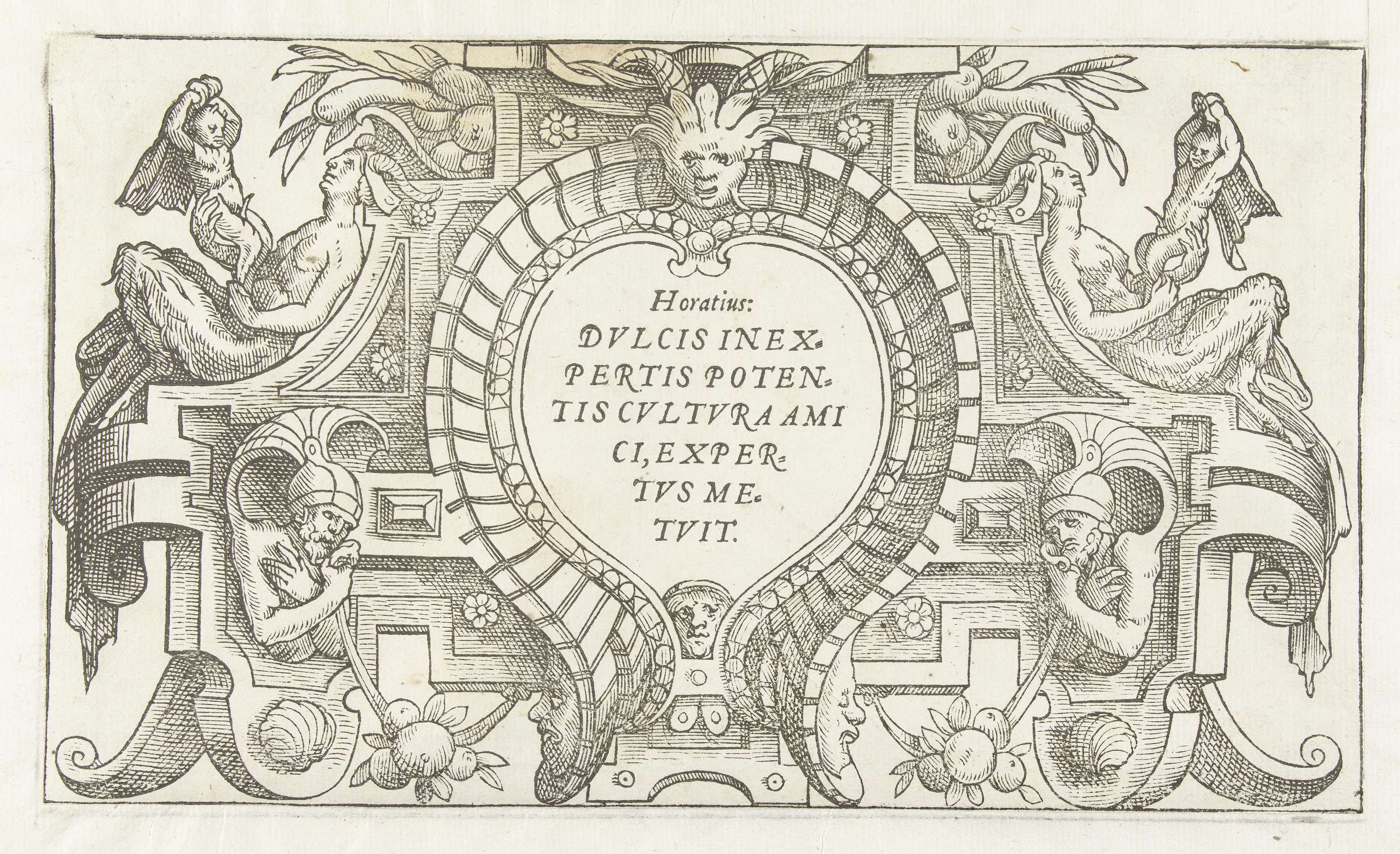 Op het rolwerk ligt zowel linksboven als rechtsboven een vrouwelijke sater met een klein satertje op schoot. Blad hoort bij 15 bladen met titelblad afkomstig uit een serie van 24 bladen. Houtsneden.