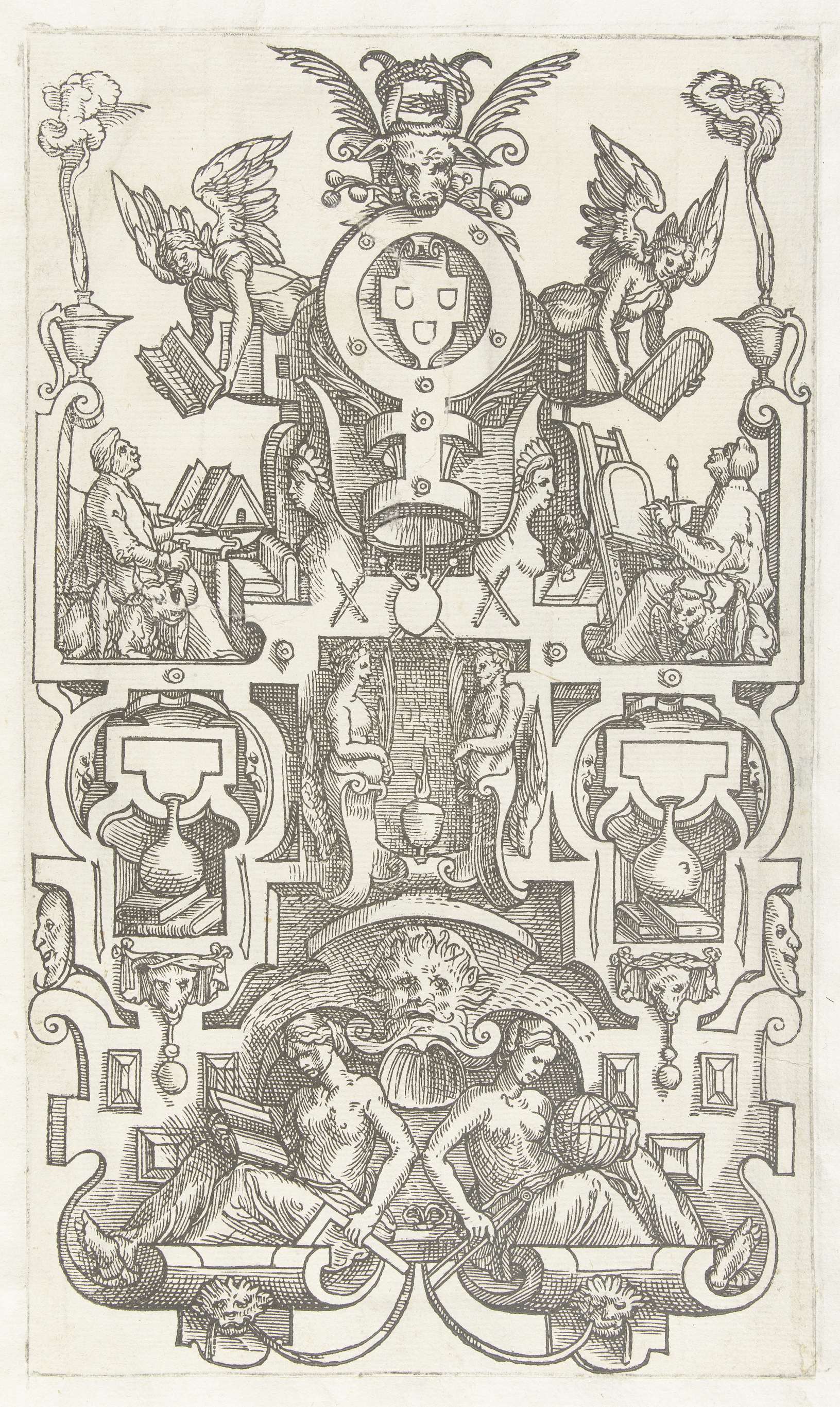Bovenaan hangt een kleine ronde cartouche met het wapen van het Lukasgilde. Ter weerszijden daarvan zit Lukas, links als evangelist en rechts als patroon van de schilders. Blad hoort bij 15 bladen met titelblad afkomstig uit een serie van 24 bladen. Houtsneden.