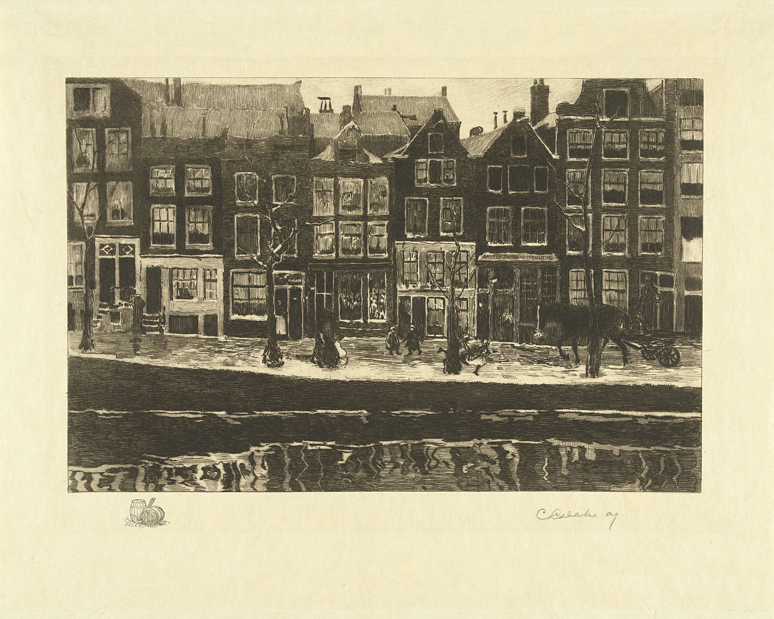 Gezicht op een huizenrij aan de Lauriergracht te Amsterdam. In de marge linksonder staat een remarque met twee tonnen. De voorstelling is een reproductie van het schilderij Lauriergracht in de collectie van het Stedelijk Museum, Amsterdam.