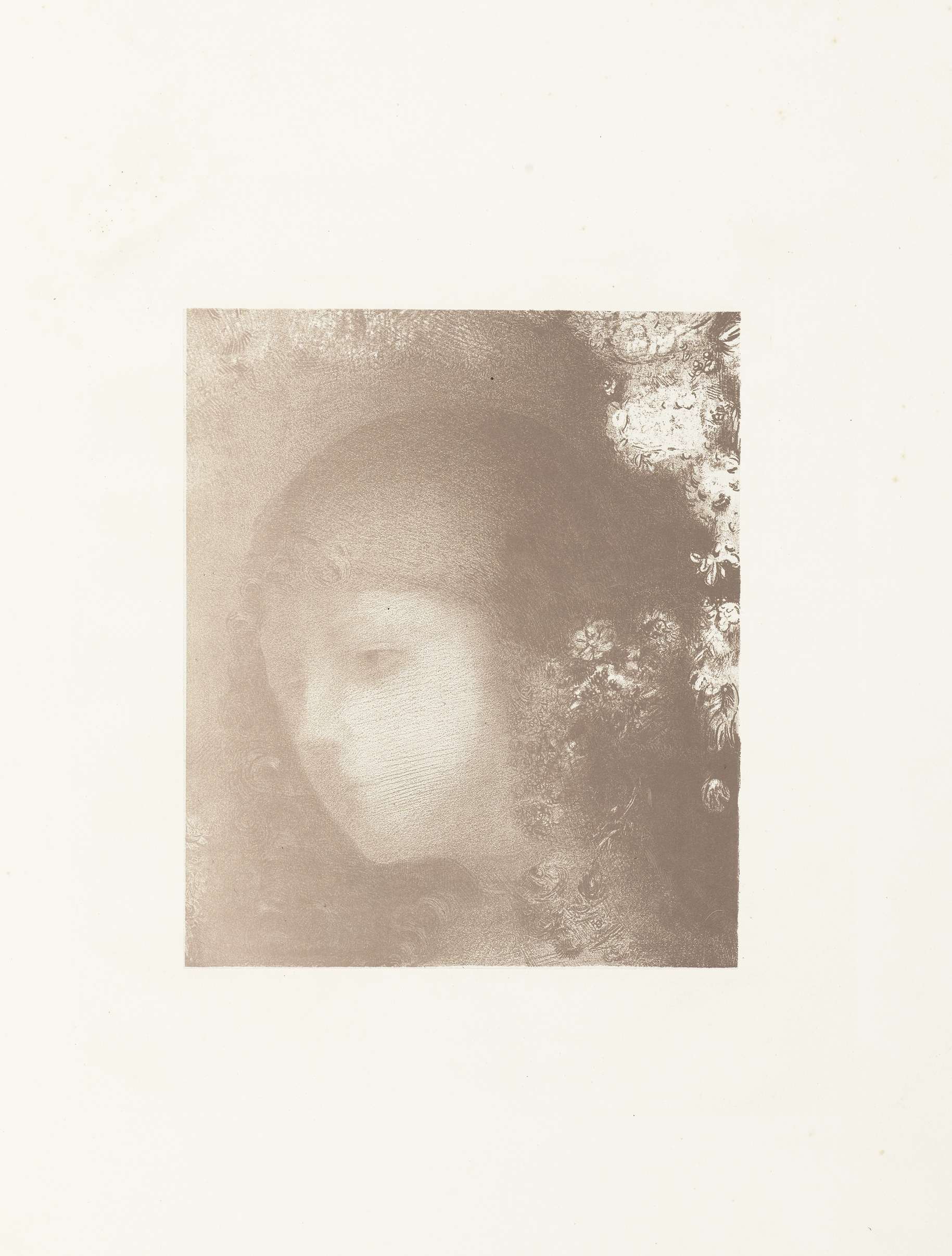 Hoofd van een meisje met krullend haar tussen de bloemen.