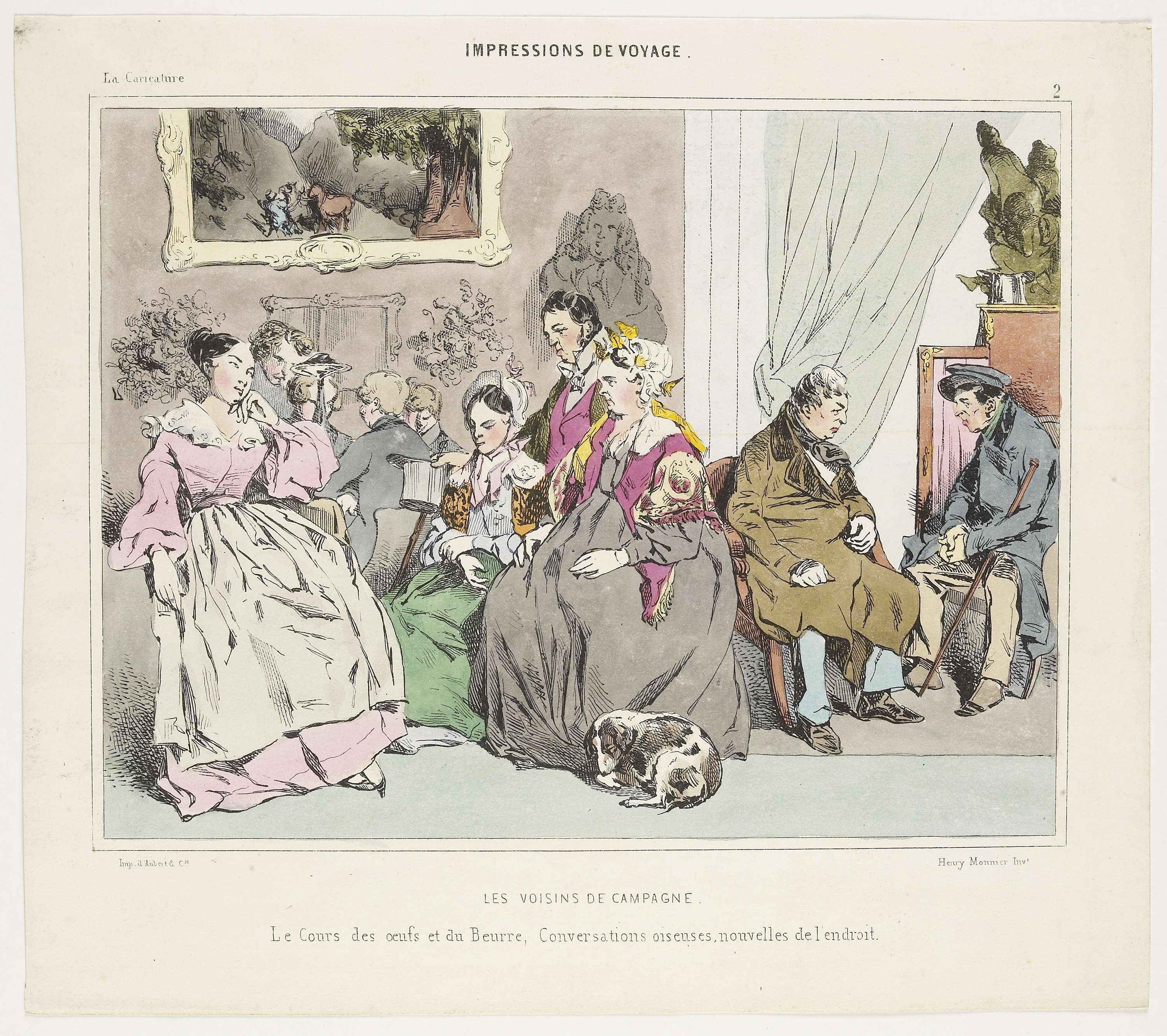 Gezelschap dames en heren buigt zich over de koers van eieren en boter en andere nieuwtjes uit de streek.