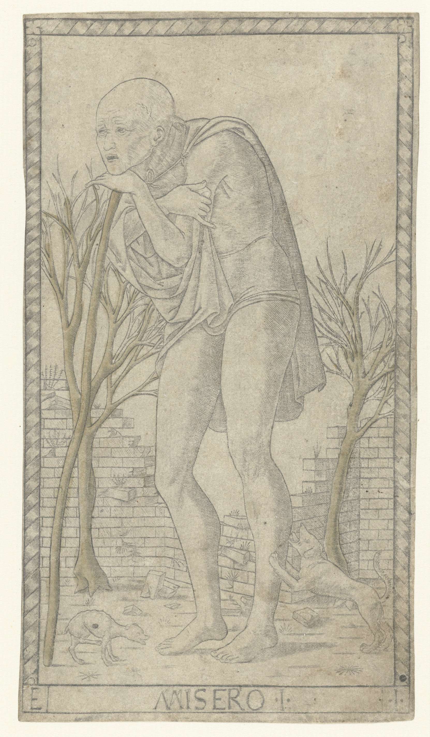 Bedelaar leunt op stok. Hij staat met twee honden voor een half afgebroken muurtje bij twee bomen. Onder de voorstelling staat de tekst MISERO I.
