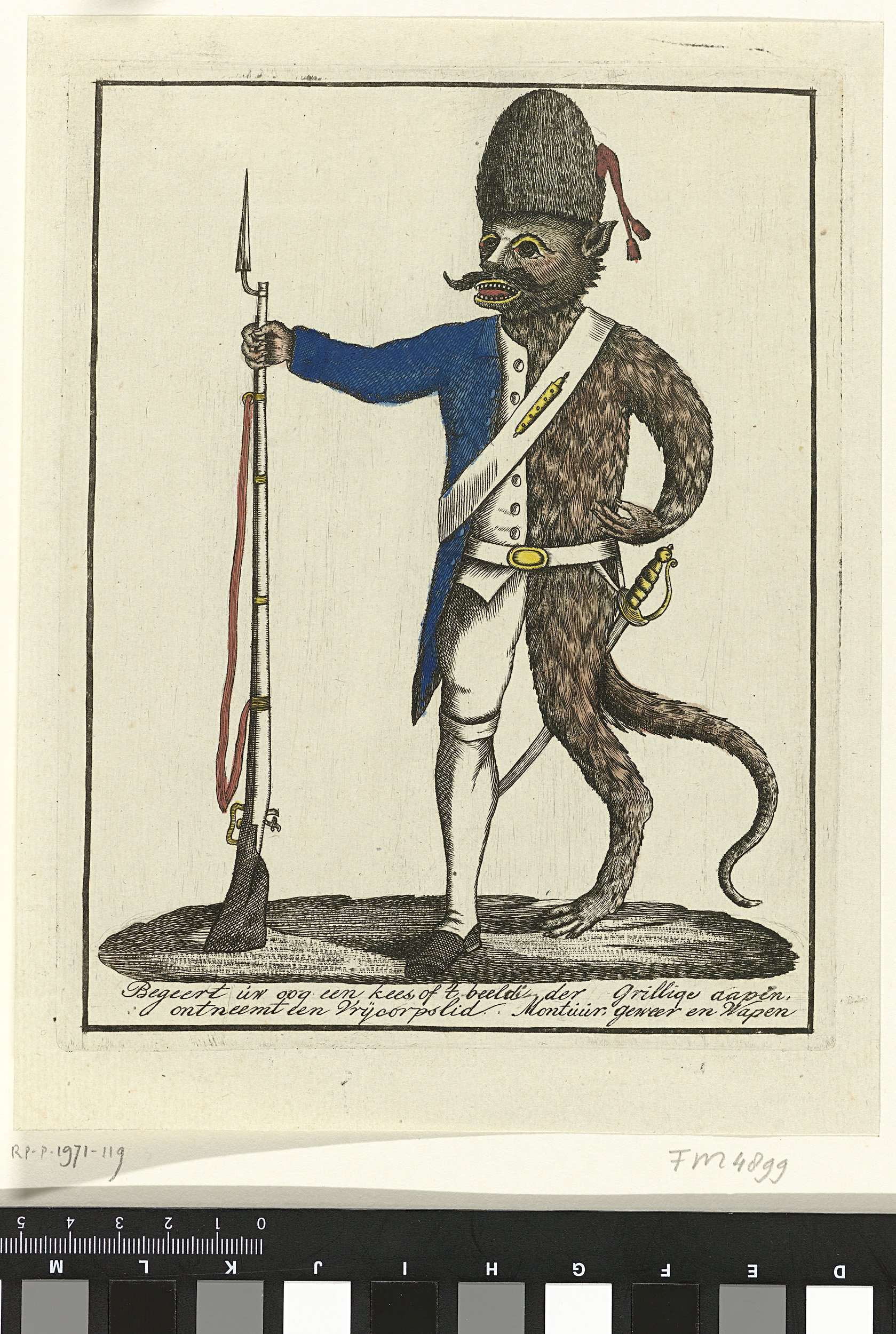 Spotprent op de Kees met geweer, voorgesteld half als een patriotse schutter en half als aap. Onderaan een tweeregelig versje.