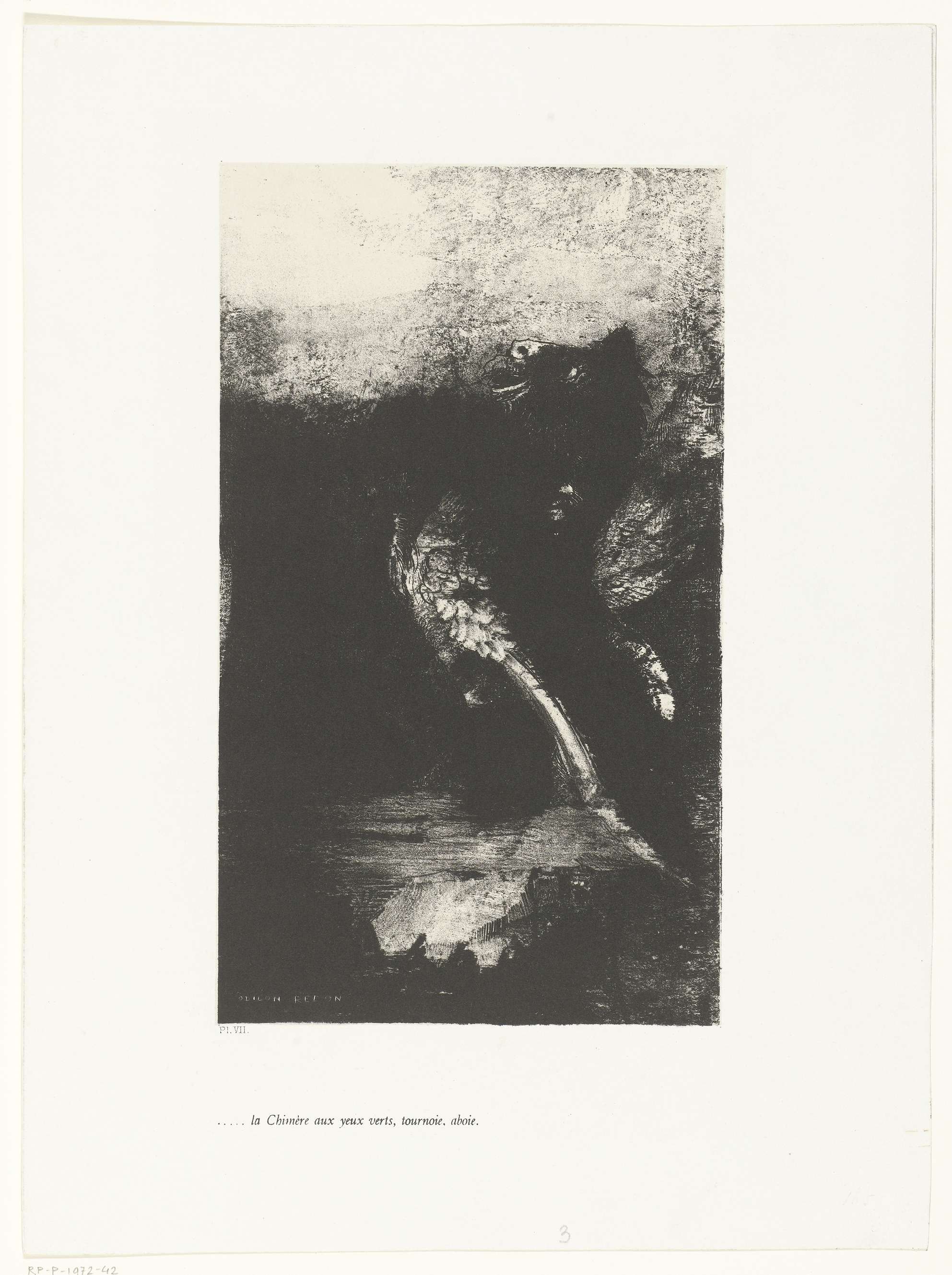 Een fabelachtig wezen met een stierenkop, vliegend boven een bergachtig landschap. Zevende prent van tien uit de eerste serie illustraties voor Gustave Flauberts De verzoeking van de heilige Antonius.
