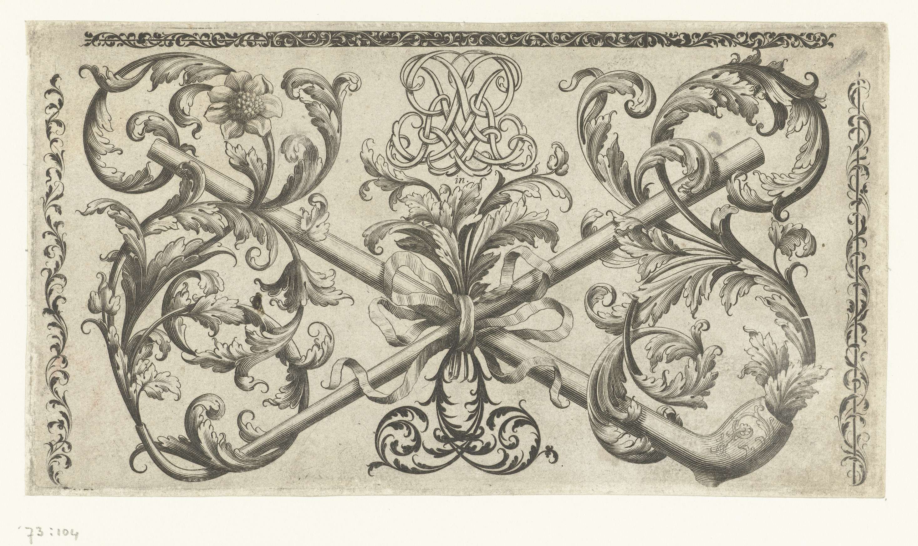 Bovenaan een monogram, aan de zijkanten drie randen met motieven. Uit serie van 7 bladen, eerste editie.