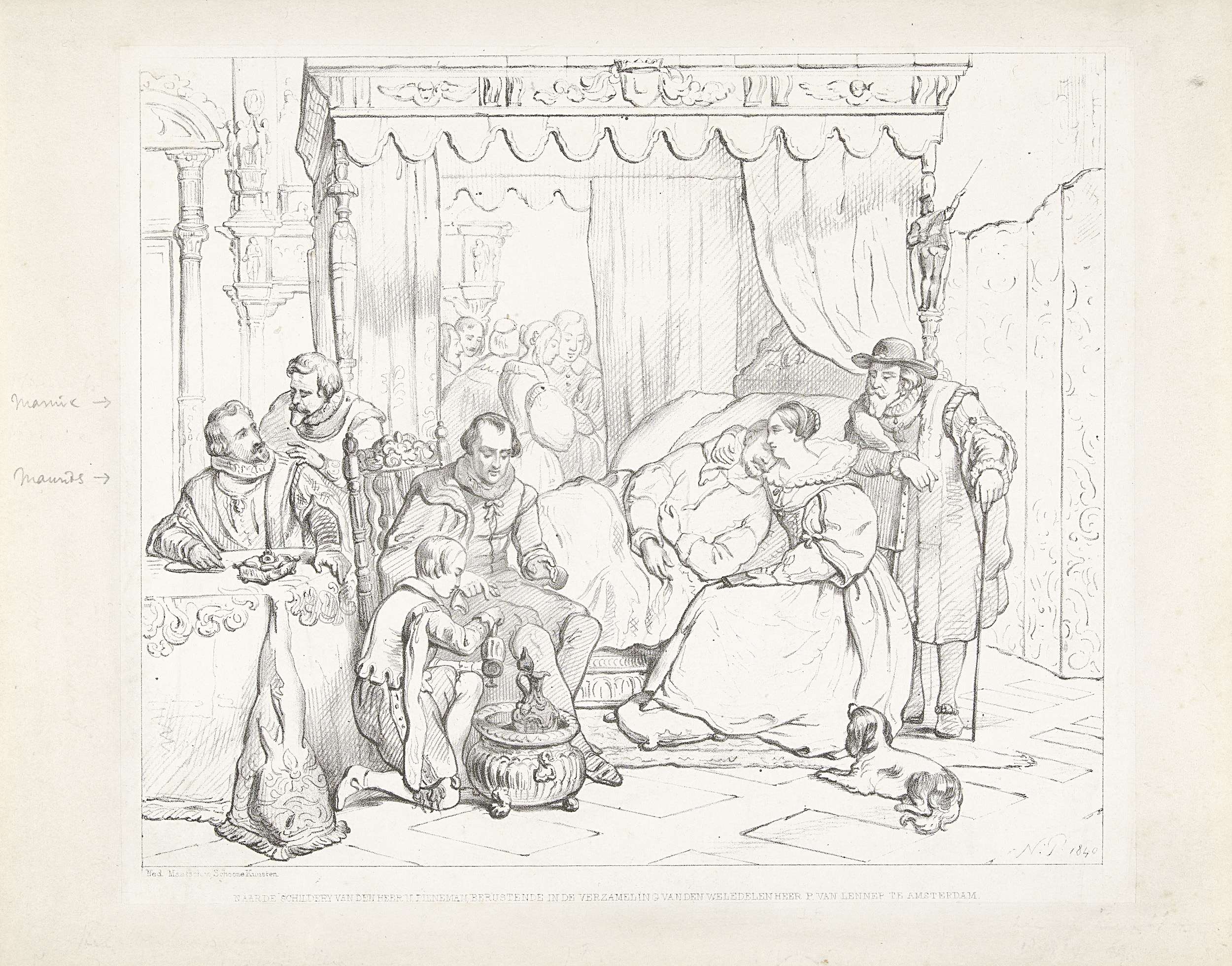 Prins Willem I herstellend van de aanslag door Jean de Jauregui, gepleegd op 18 maart 1582, te Antwerpen. De prins liggend in bed verzorgd door artsen en getroost door zijn vrouw Charlotte de Bourbon.