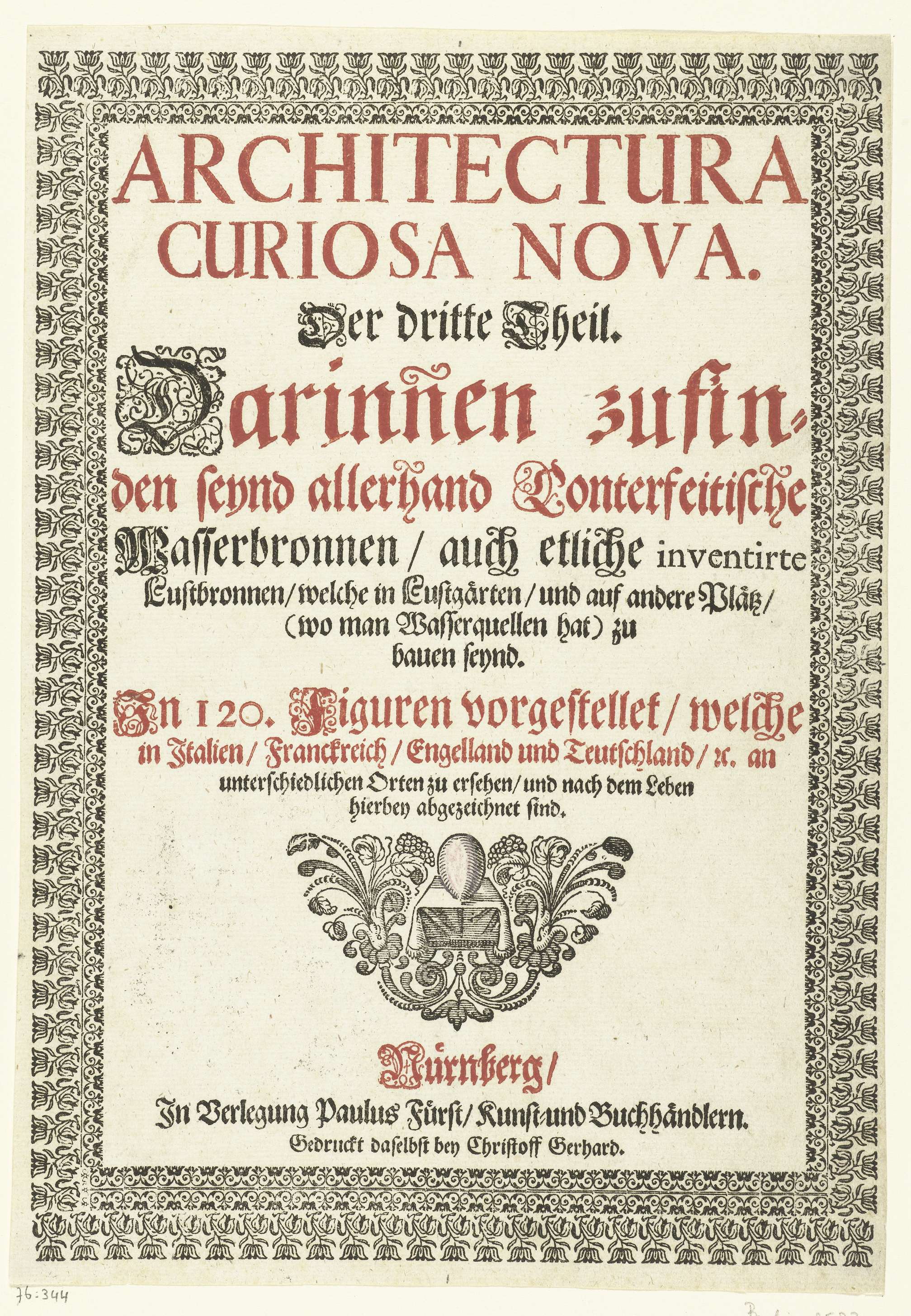 De tekst in rood en zwart staat in een decoratieve rand met bloemmotieven. Tussen de tekst in staat een vignet. Titelblad van deel III van een serie bestaande uit 226 bladen, verdeeld over vier boeken, elk met een eigen titelblad.