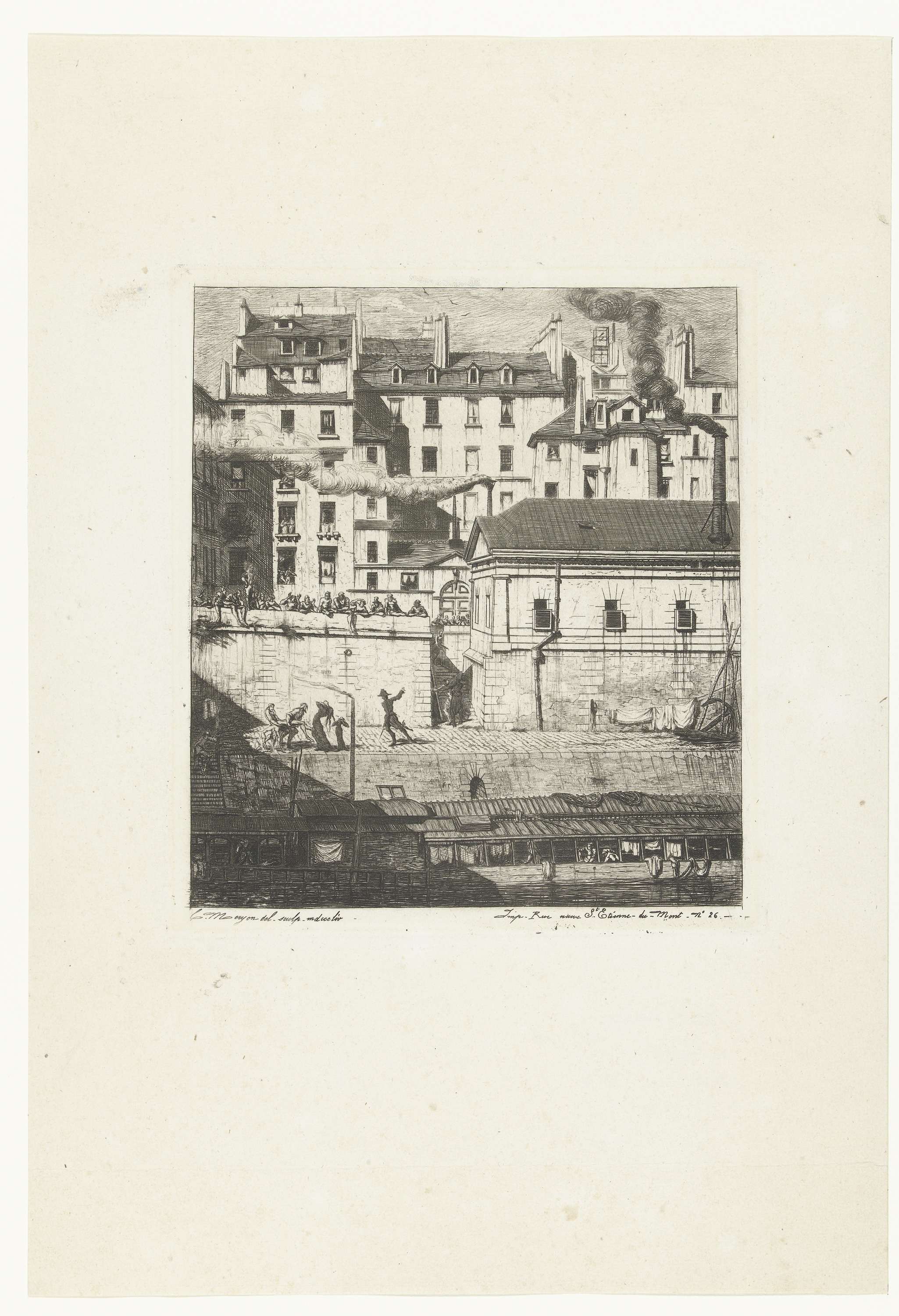 Het lijkenhuis of Morgue van Parijs staat met rokende schoorstenen op de kade van de Seine. Op de kade wordt een lijk richting het gebouw gedragen terwijl een vrouw en kind rouwen. De kademuur zit vol toeschouwers.