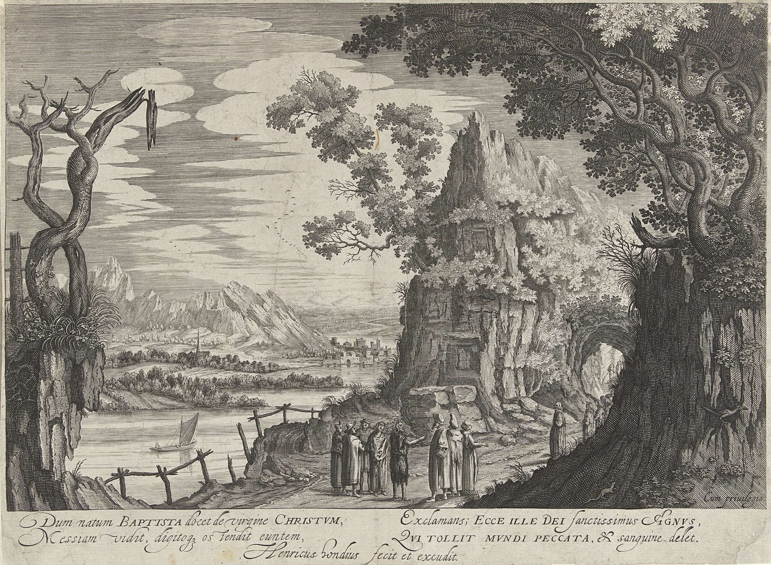 weids rotsachtig landschap met links een rivier en rechts bomen en een rots langs een weg. Op de landweg staat een groepje mannen. Een van hen, Johannes de Doper, wijst naar Christus en identificeert hem als het Lam Gods.