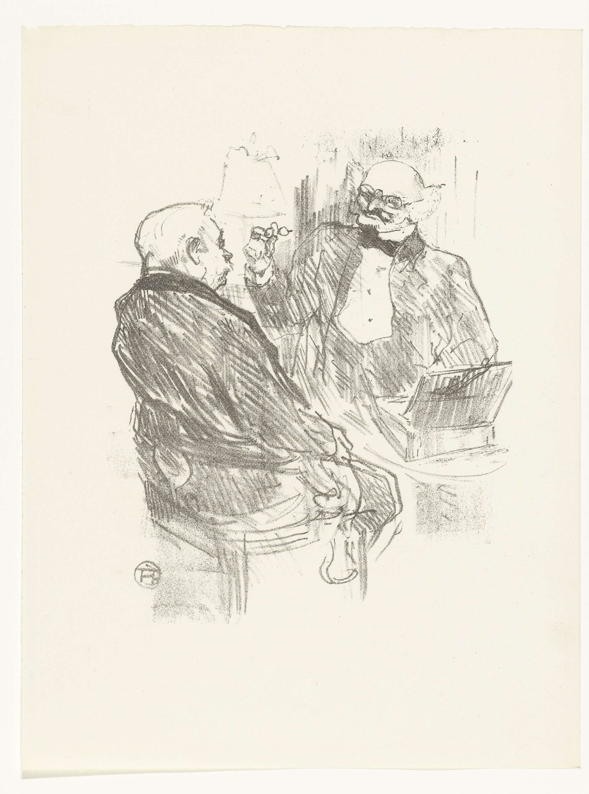 Georges Clemenceau zit in een stoel tegenover oogarts Mayer die Clemenceau een bril voorhoudt.