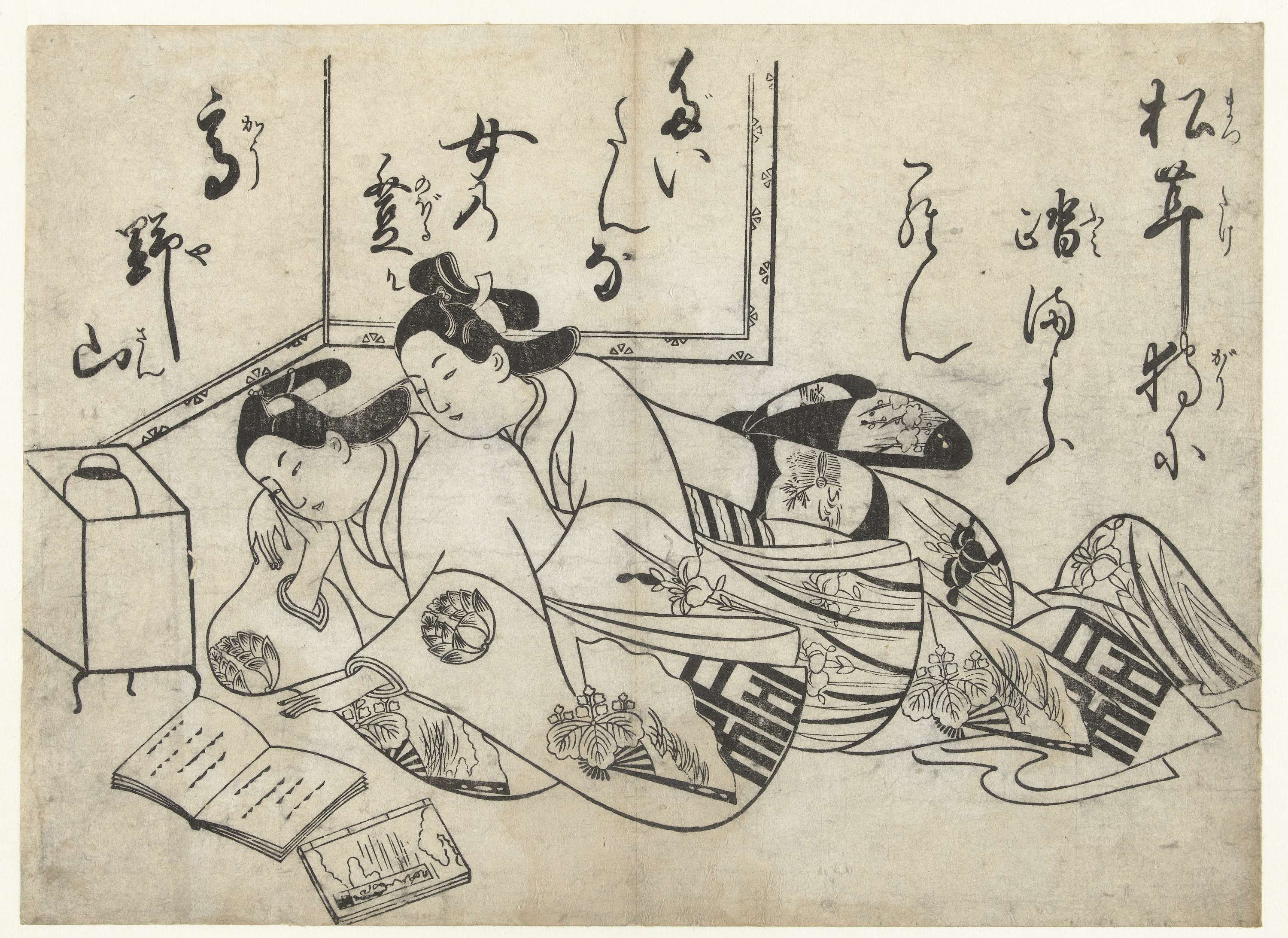 Man, in kimono met patroon van kabuki emblemen, en vrouw, in kimono met patroon van irissen, tegen elkaar aan liggend, een boek lezend, bij lantaarn; op de achtergrond een kamerscherm.