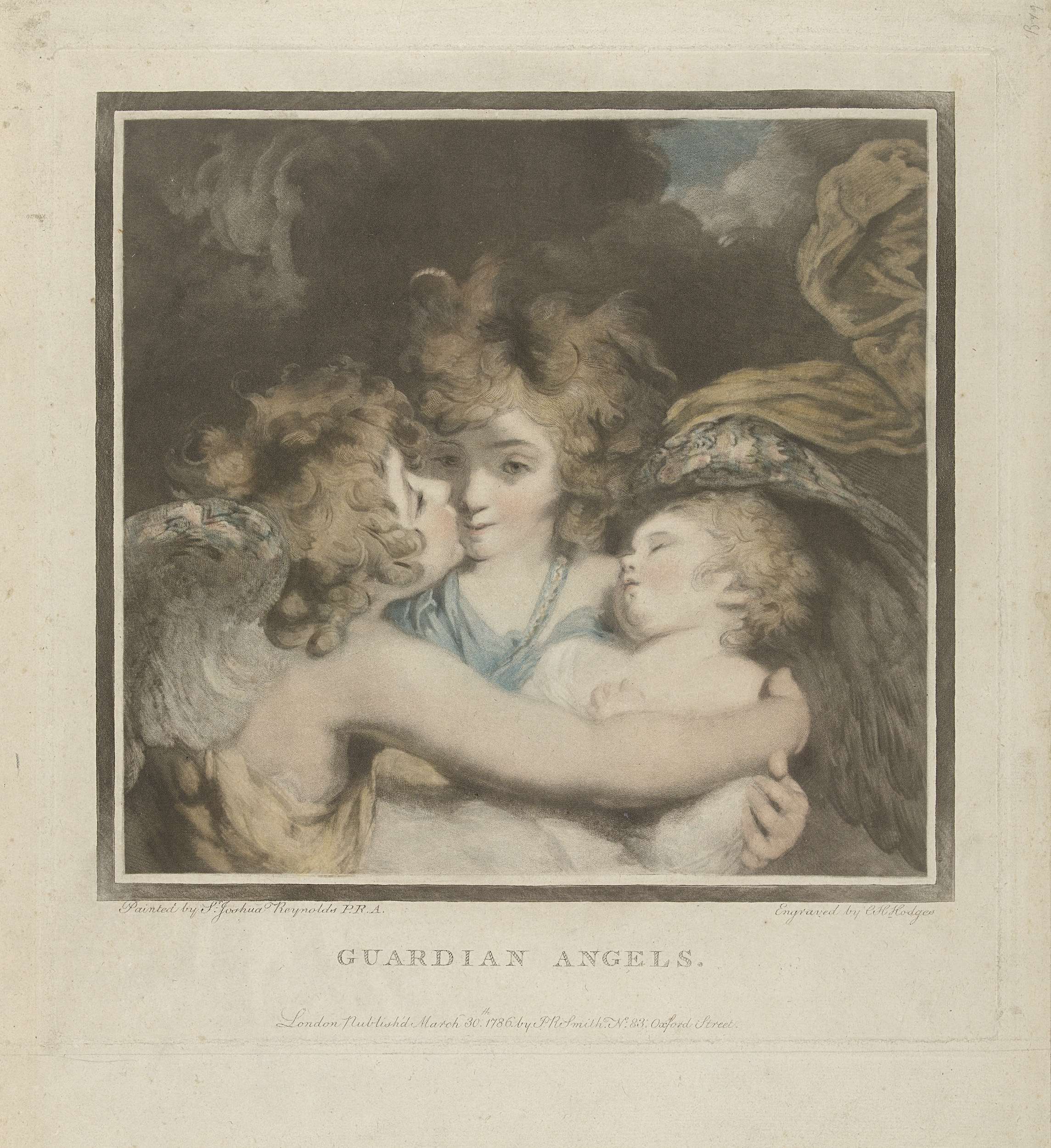Een jong slapend kind ligt in de armen van twee eveneens jonge engelen die elkaar een kus geven. Onder de voorstelling de titel in het Engels.