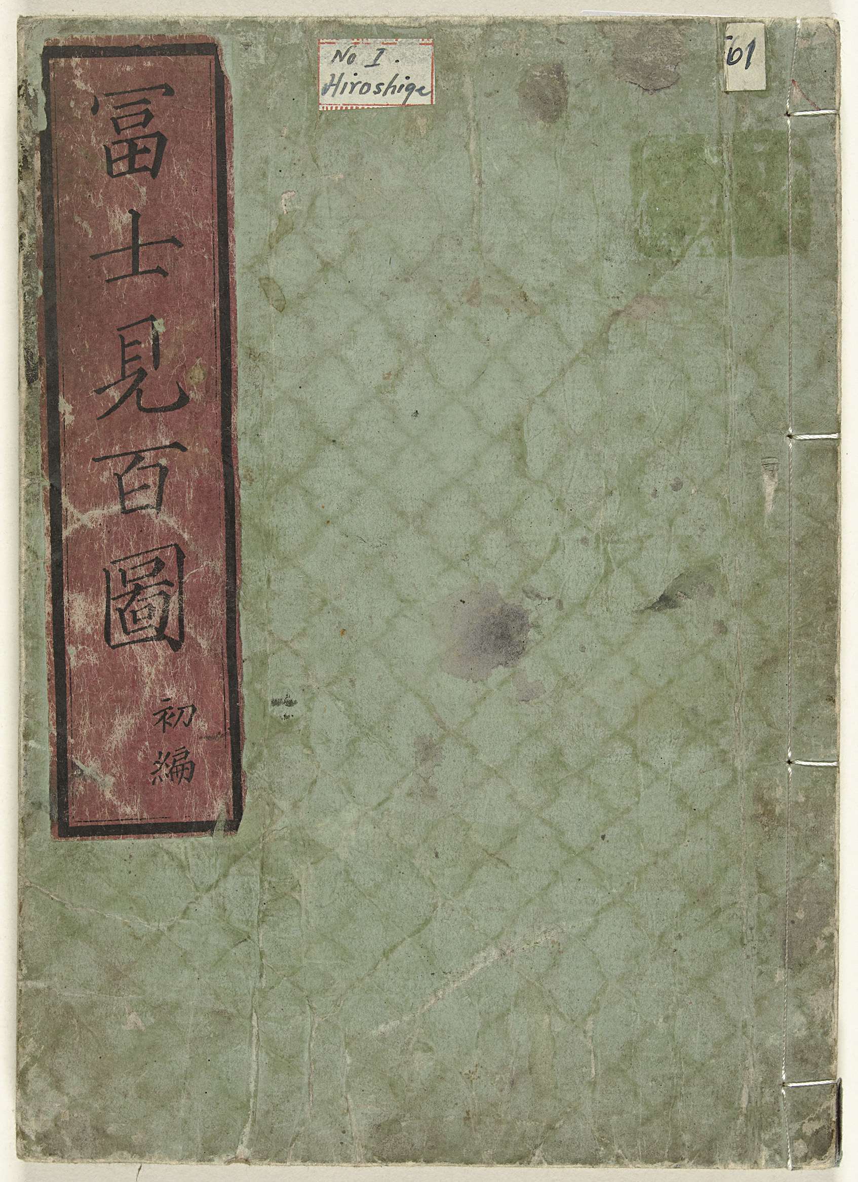 Groene kaft met ruitpatroon in blinddruk; linksboven rood-zwarte titelstrook; 23 bladen, genummerd: twee bladen, voorwoord; één pagina, afbeelding van man met pop; 1-20, afbeeldingen van de berg Fuji; 21, signatuur van Hiroshige.