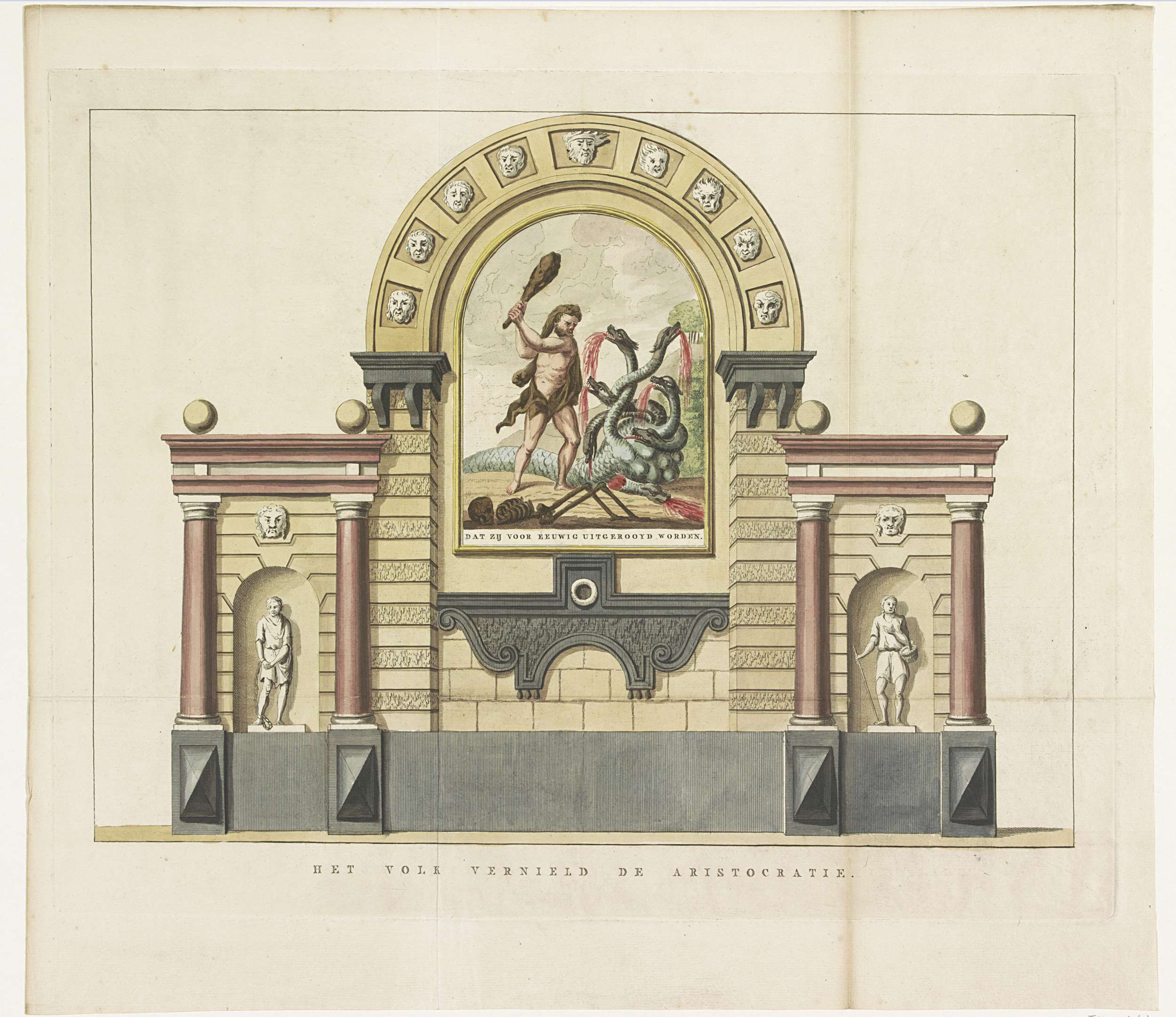 De Vernietiging der Aristocratie, allegorische decoratie opgericht op de Westermarkt te Amsterdam bij het Alliantiefeest op 19 juni 1795. Hercules (het Nederlandse volk) verslaat de zevenkoppige hydra (aristocratie en familieregering).