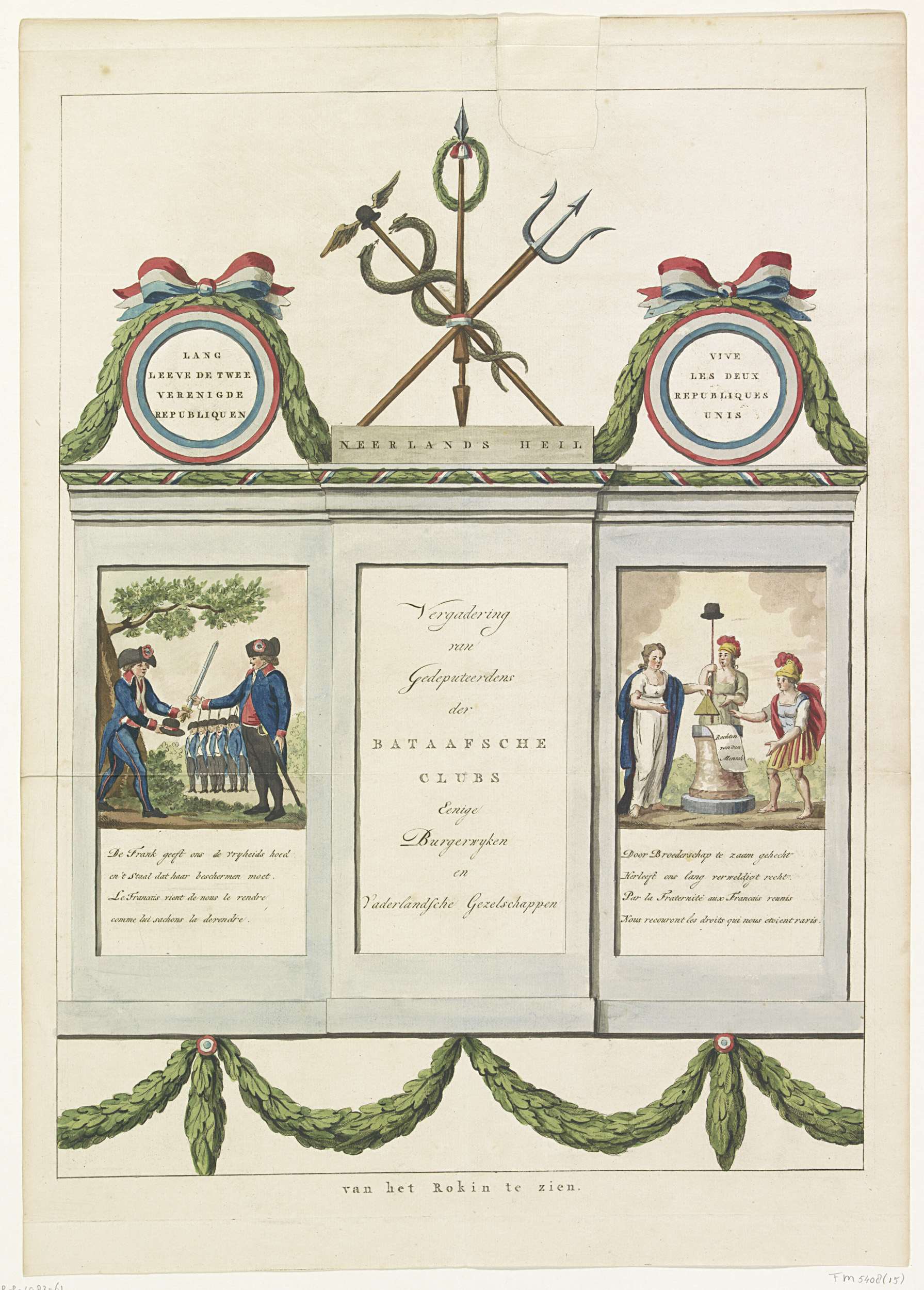 Decoratie in de Beurssteeg, gezien vanaf het Rokin, 1795. Opgericht door een Vergadering van Gedeputeerden van de Bataafsche Clubs, Burgerwijken en Vaderlandsche Gezelschappen te Amsterdam bij het Alliantiefeest op 19 juni 1795. Op de twee chassinetten allegorieën van de vrijheid door Frankrijks wapens en van de Rechten van de Mens, elk met een vierregelig vers.