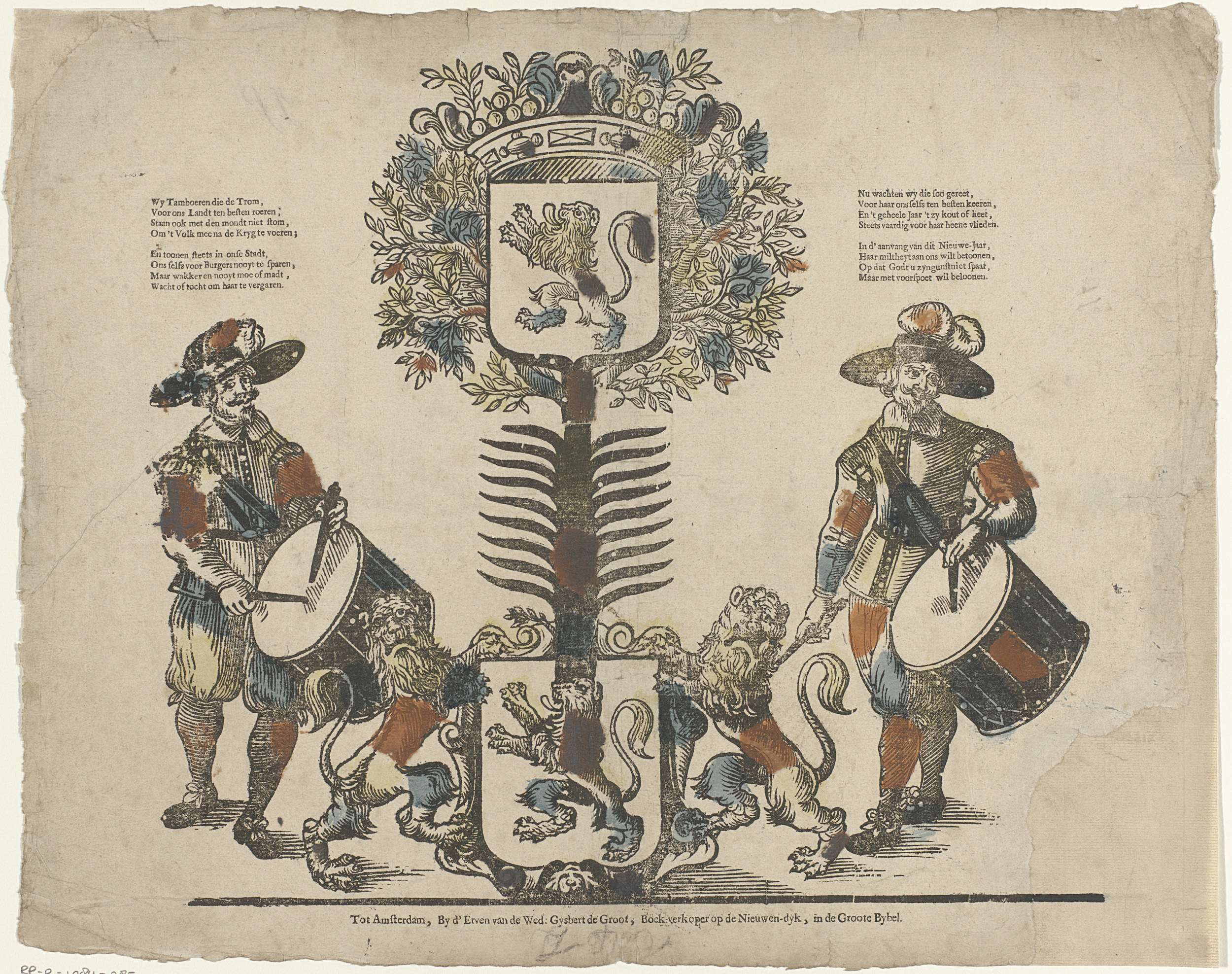 Blad met een grote voorstelling van een boom met twee wapenschilden, één bij de wortels en één in de kruin. Aan weerszijden van de boom een leeuw en een tamboer. Boven de tamboers twee achtregelige verzen.