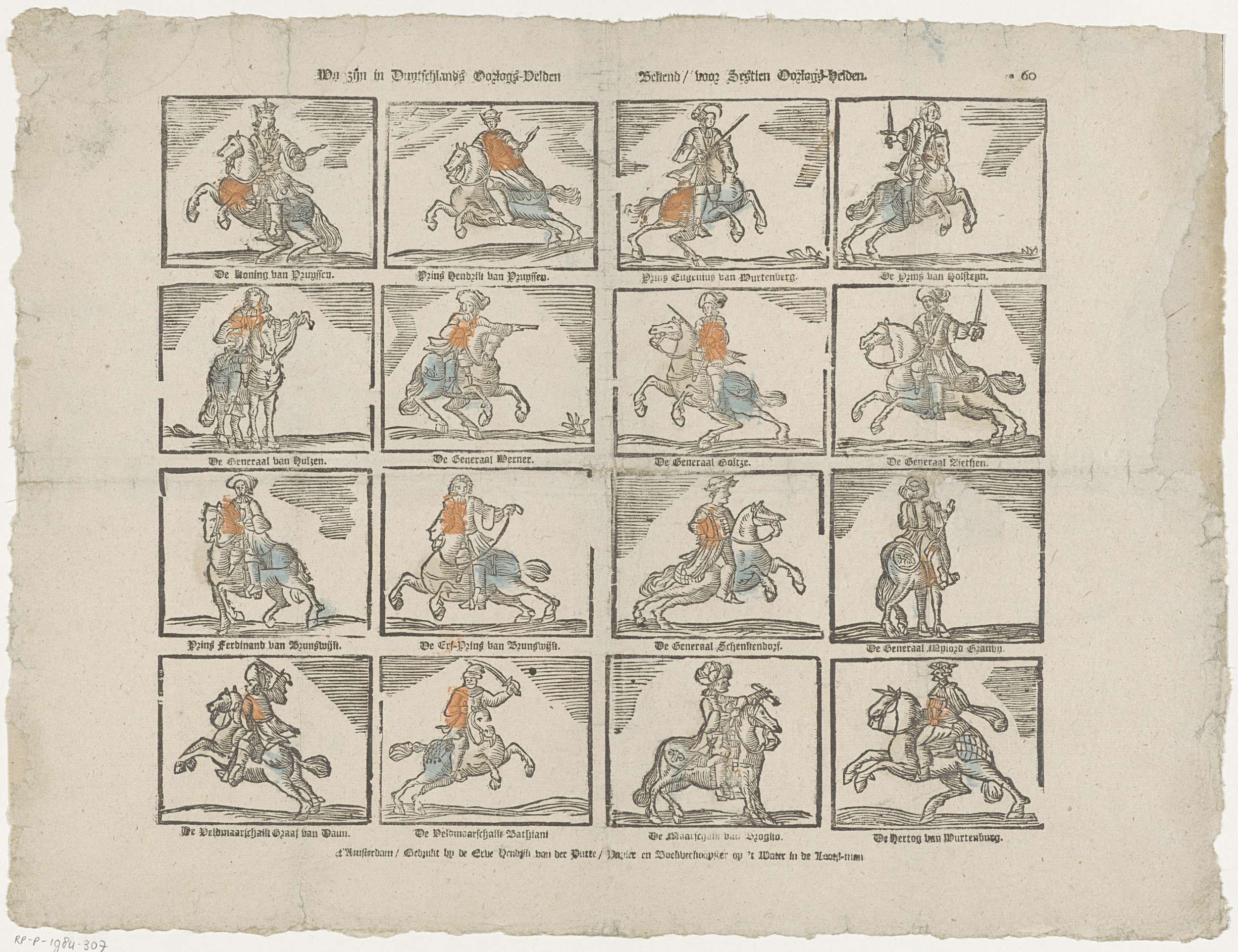 Blad met 16 voorstellingen van vorsten en generaals te paard, onder wie Frederik Hendrik Lodewijk (prins van Pruisen) en Frederik Willem I (koning van Pruisen). Onder elke afbeelding een onderschrift. Genummerd rechtsboven: *60.