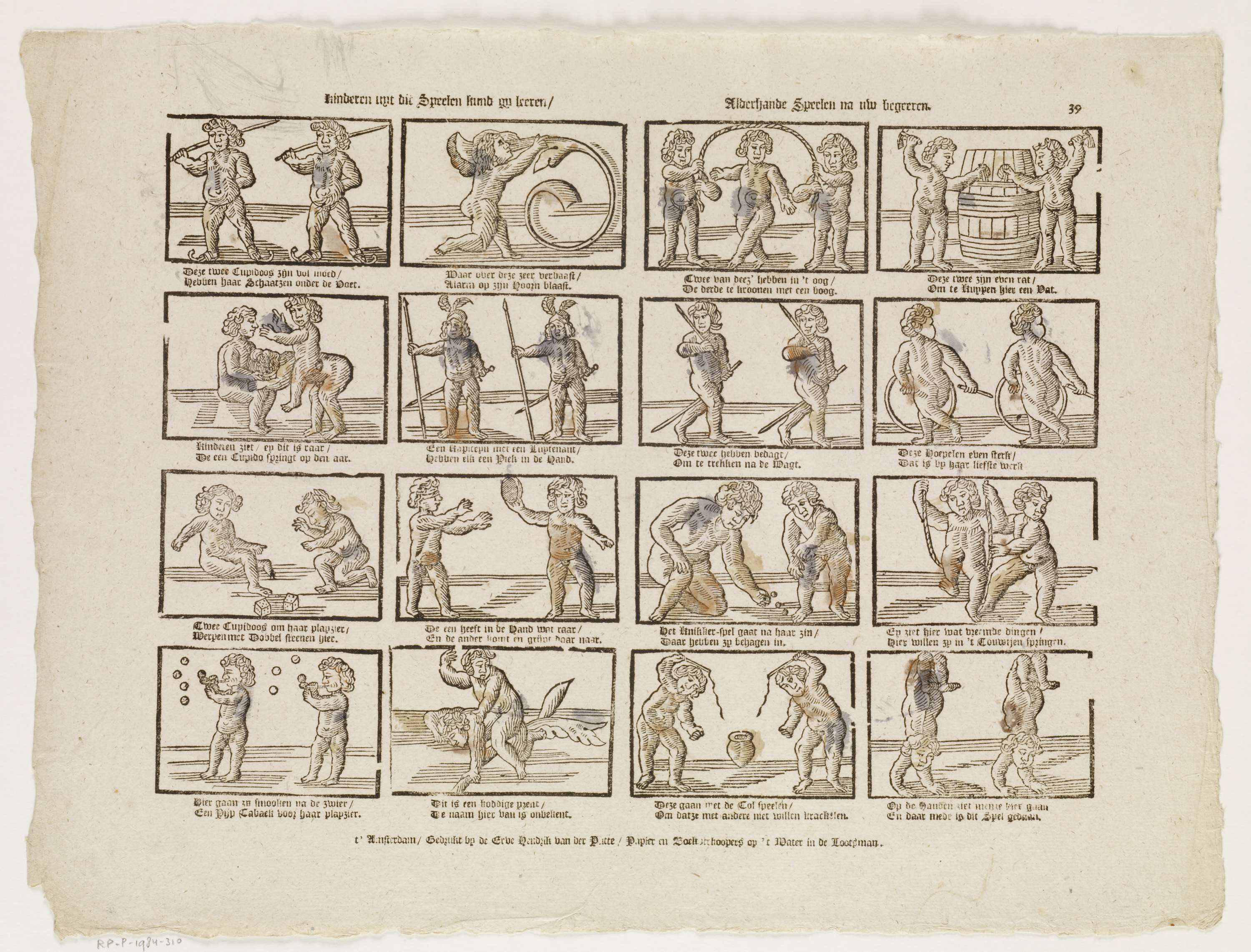 Blad met 16 voorstellingen van kinderspelen en bezigheden voorgesteld met Cupido's, zoals touwtjespringen en tollen. Onder elke afbeelding een tweeregelig vers. Genummerd rechtsboven: 39.