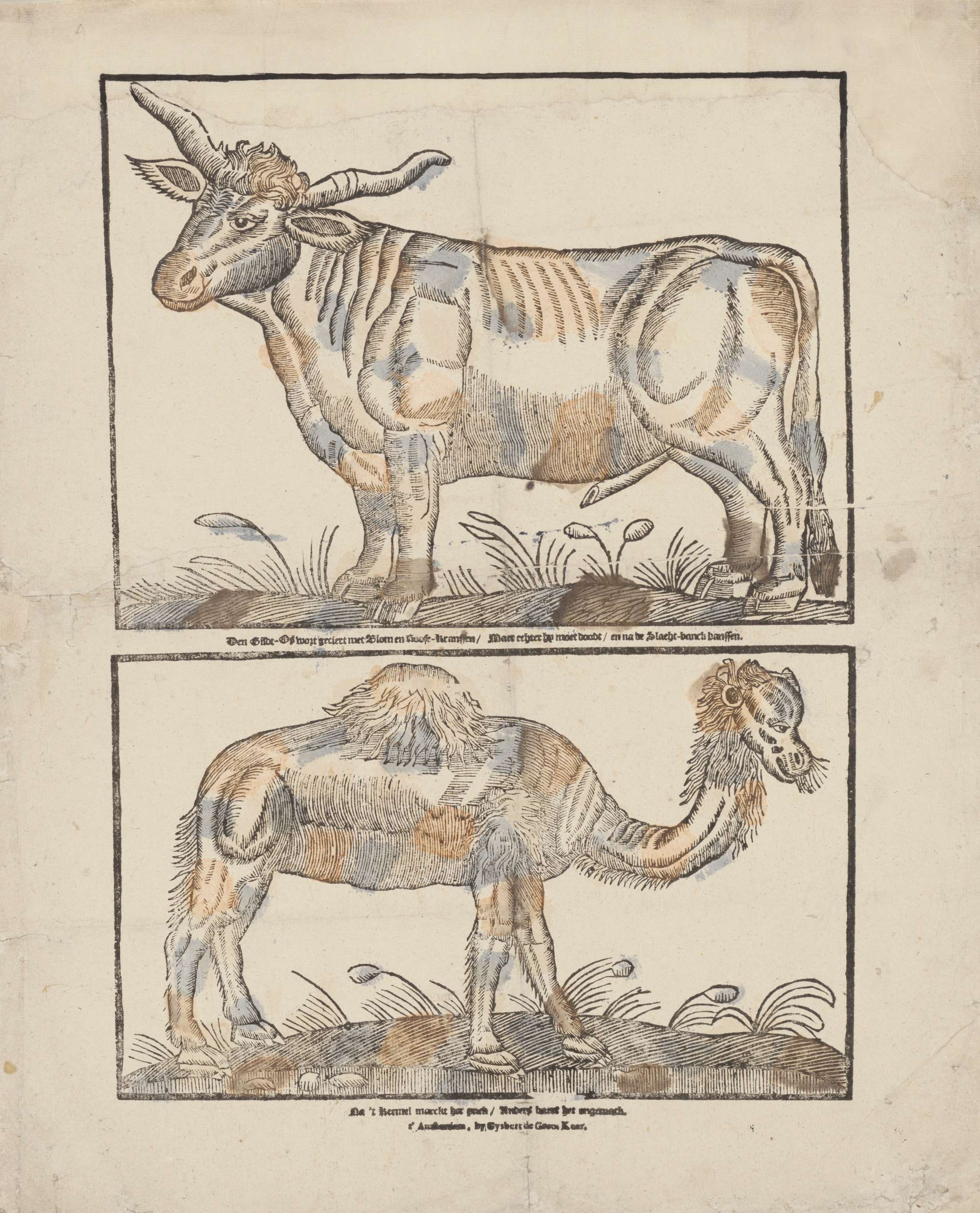 Blad met 2 voorstellingen van een os (in de tekst aangeduid als een gilde-os) en een dromedaris (in de tekst aangeduid als een kameel). Onder elke afbeelding een onderschrift.