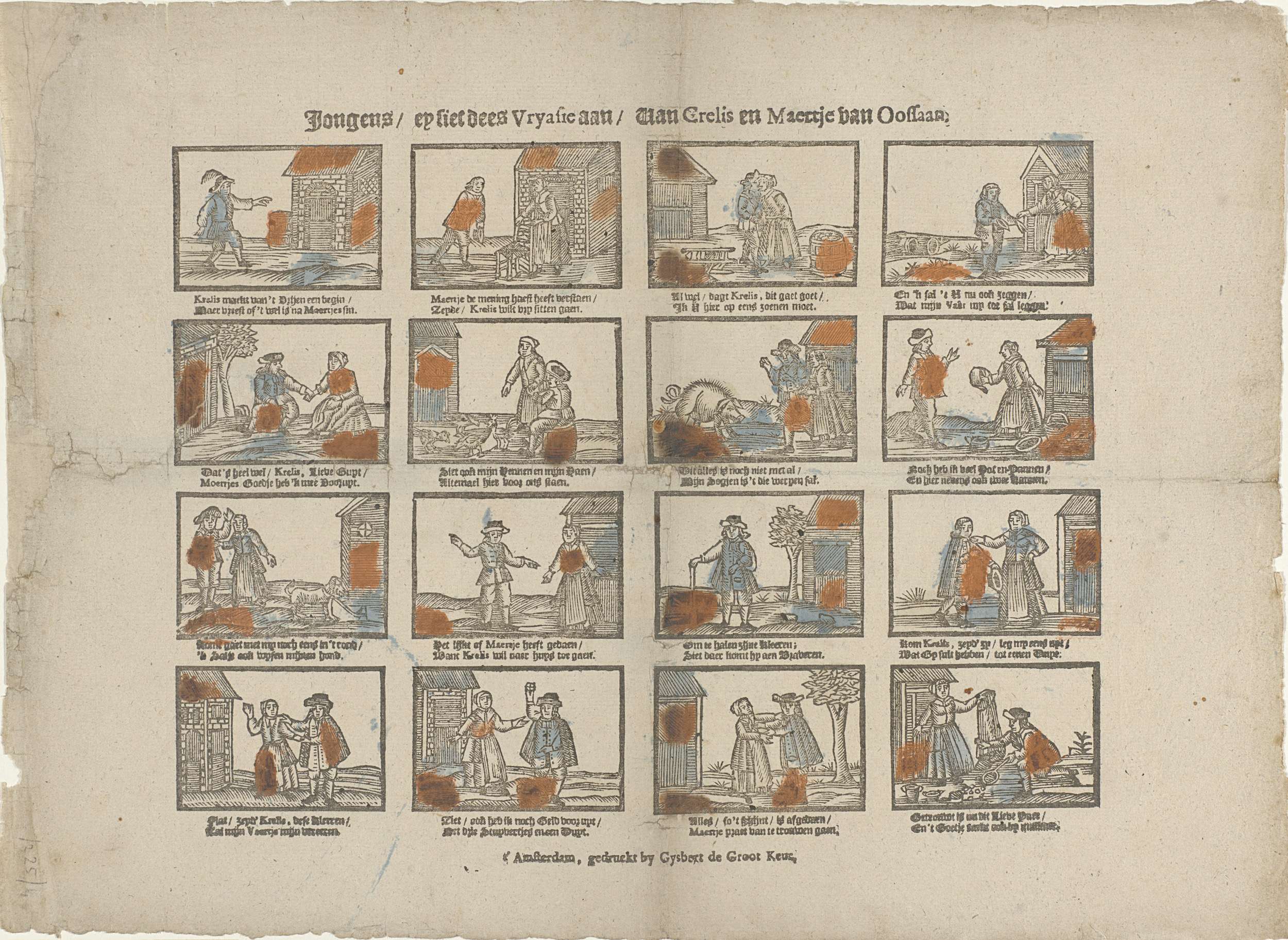 Blad met 16 voorstellingen van de vrijage van de arme Krelis en Maartje van Oostzaan. Onder elke afbeelding een tweeregelig vers.