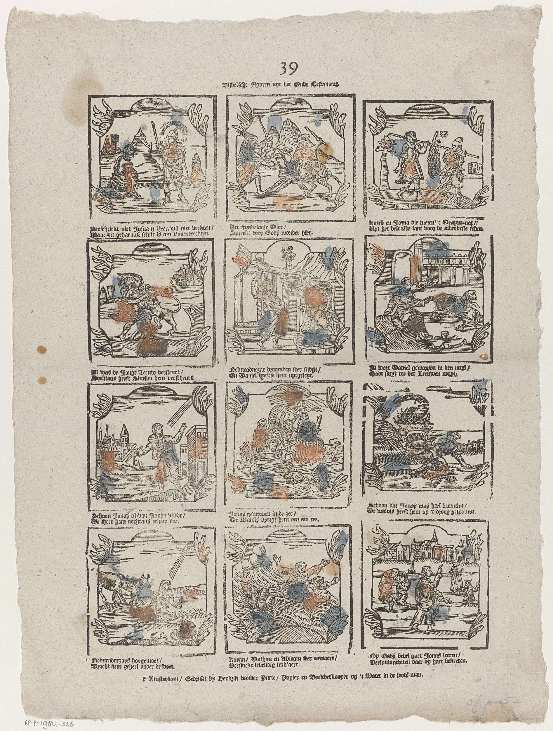 Blad met 12 voorstellingen van verhalen uit het Oude Testament, zoals Simson en de leeuw en Jona die op het droge wordt geworpen. Onder elke afbeelding een tweeregelig vers. Genummerd midden boven: 39.