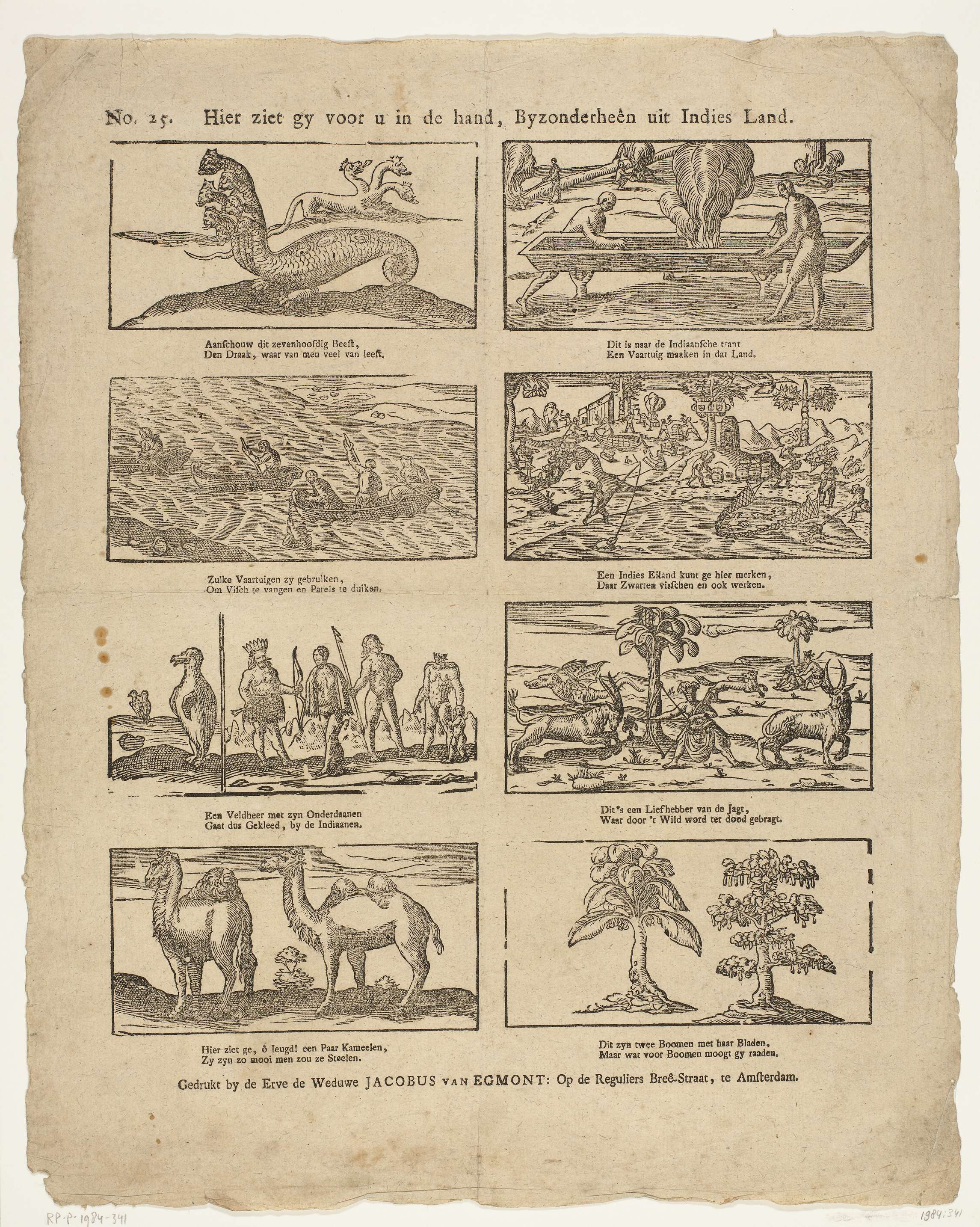Blad met acht voorstellingen van (fantasie)dieren en vaartuigen, waaronder een zevenkoppige draak, een roeiboot, gemzen en een kameel. Onder elke afbeelding een tweeregelig vers. Genummerd linksboven: No. 25.