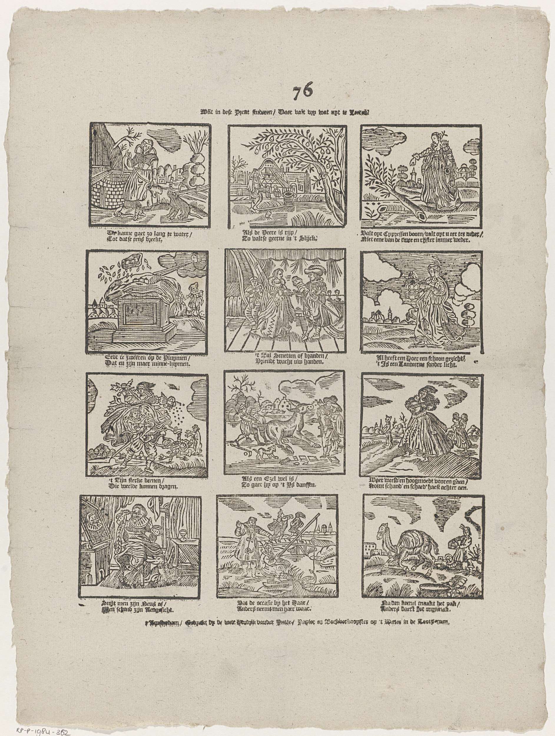 Blad met 12 verbeeldingen van spreekwoorden. Onder elke afbeelding een tweeregelig vers. Genummerd midden boven: 76