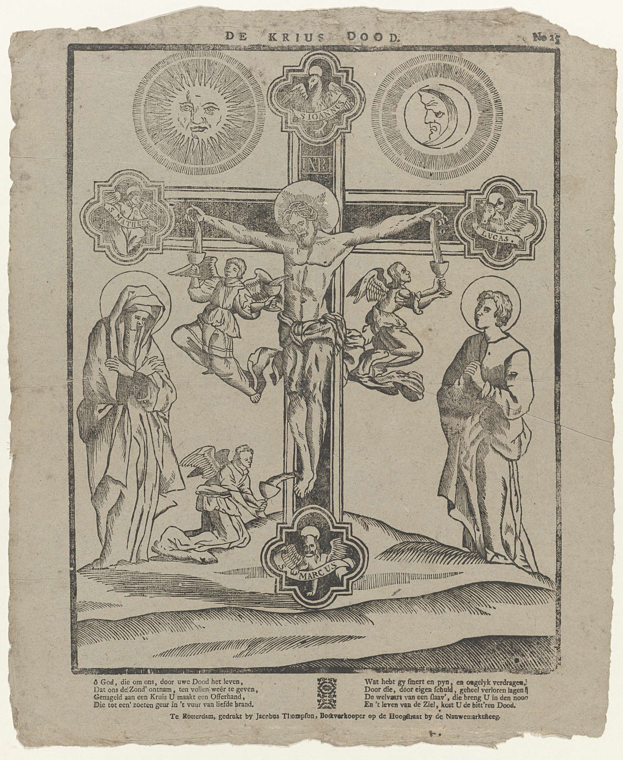 Christus aan het kruis, met Maria en Johannes onder het kruis. Engelen vangen het bloed van Christus op in kelken. Het kruis is versierd met de symbolen van de vier Evangelisten. Boven het kruis de zon en de maan. Onder de voorstelling een achtregelig vers in twee kolommen. Genummerd rechtsboven: No. 25.