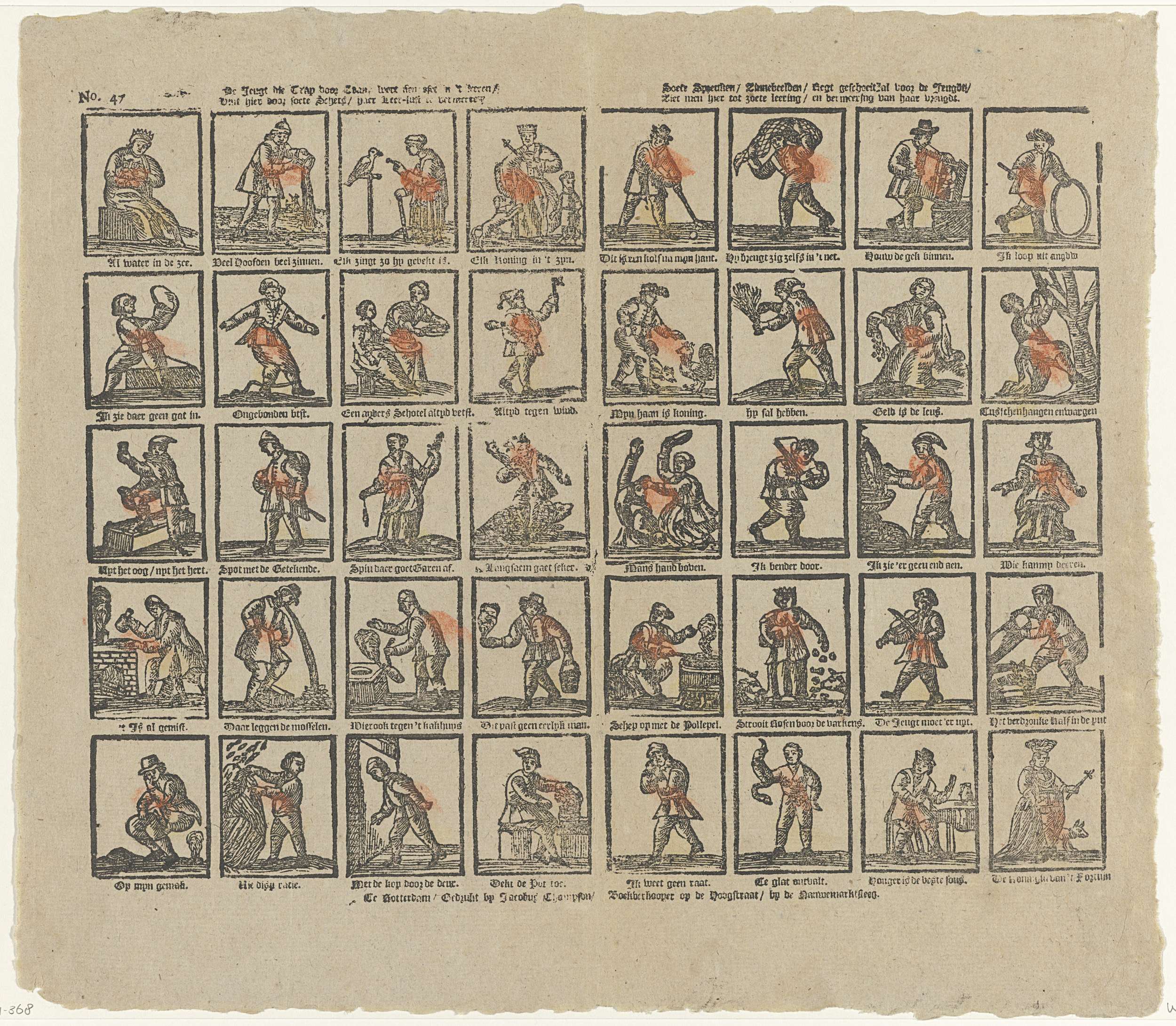 Blad met 40 uitbeeldingen van uitdrukkingen, waaronder 'Elk koning in 't zyn', 'Myn haan is koning' en 'De jeugt moet er uyt'. Onder elke afbeelding een onderschrift. Genummerd linksboven: No. 47.