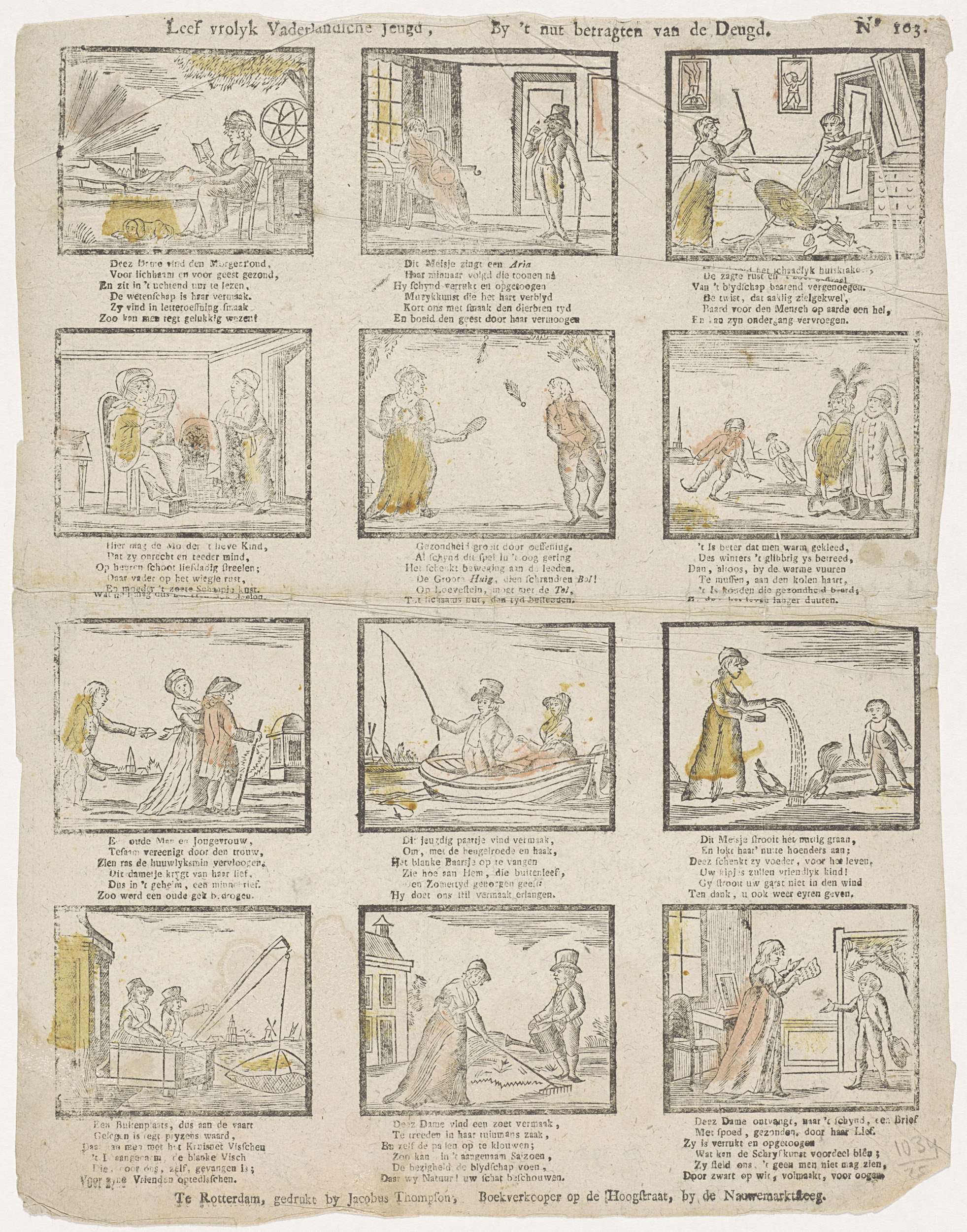 Blad met 12 voorstellingen van verschillende toestanden en bezigheden, waaronder schaatsen, een vrouw die een brief krijgt van haar jongere minnaar en een jeugdig paar dat vist. Onde relke afbeelding een zesregelig vers. Genummerd rechtsboven: No. 103.