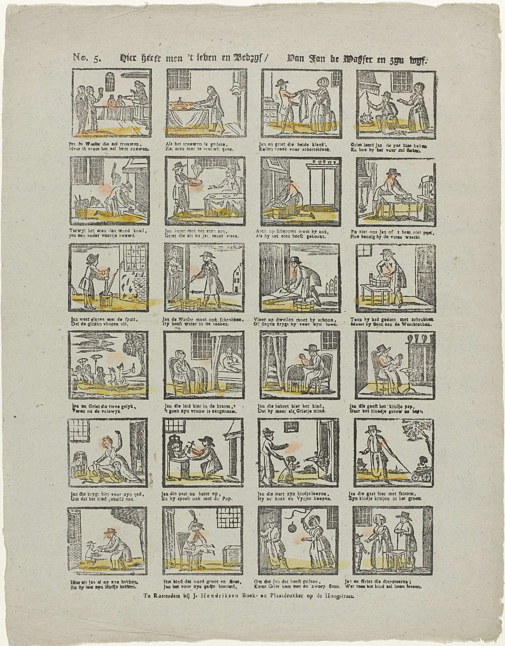 Blad met 24 voorstellingen over het leven van Jan de Wasser, een man die van zijn vrouw Griet, die de broek aan heeft, al het huishoudelijk werk moet doen. Onder elke afbeelding een tweeregelig vers. Genummerd linksboven: No. 5.