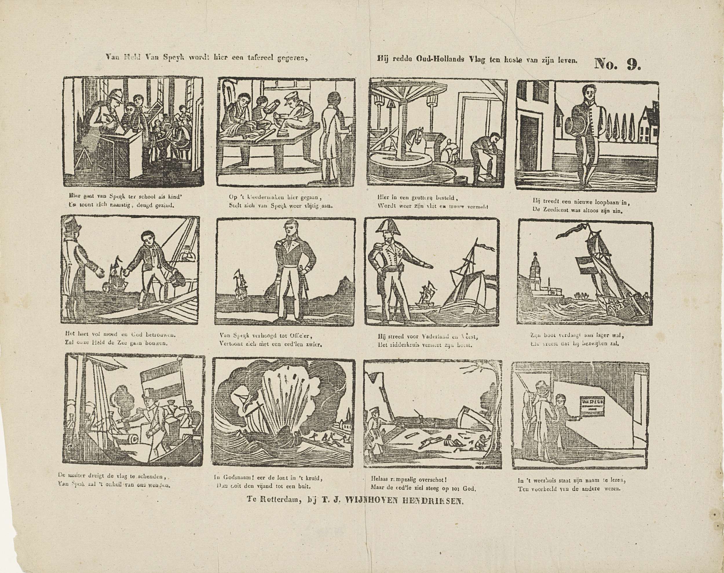 Blad met 12 voorstellingen over het leven en de zelfopoffering van J.C.J. Van Speyk tijdens de strijd tegen de Belgen. Onder elke afbeelding een tweeregelig vers. Genummerd rechtsboven: No. 9.
